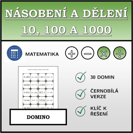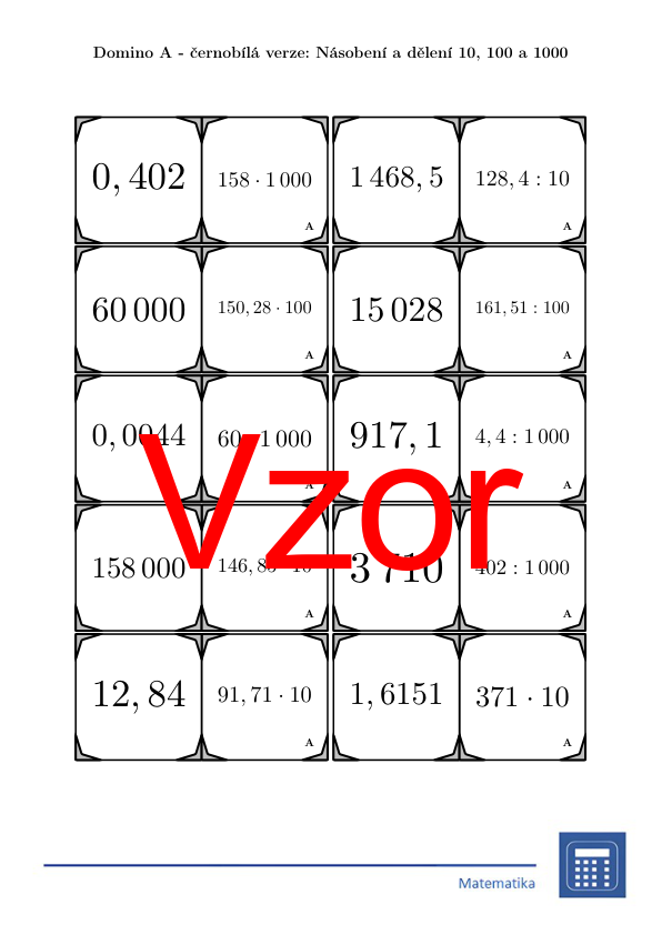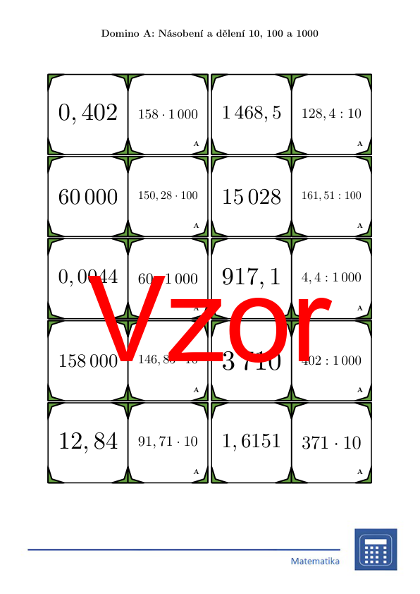 V materiálu se nachází celkem 30 různých sad domin na téma násobení a dělení 10, 100 a 1000 v následujícím uspořádání: