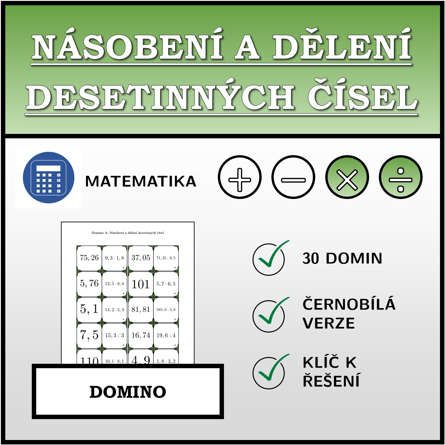 V materiálu se nachází celkem 30 různých sad domin na téma násobení a dělení desetinných čísel v následujícím uspořádání: