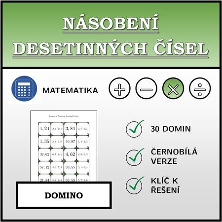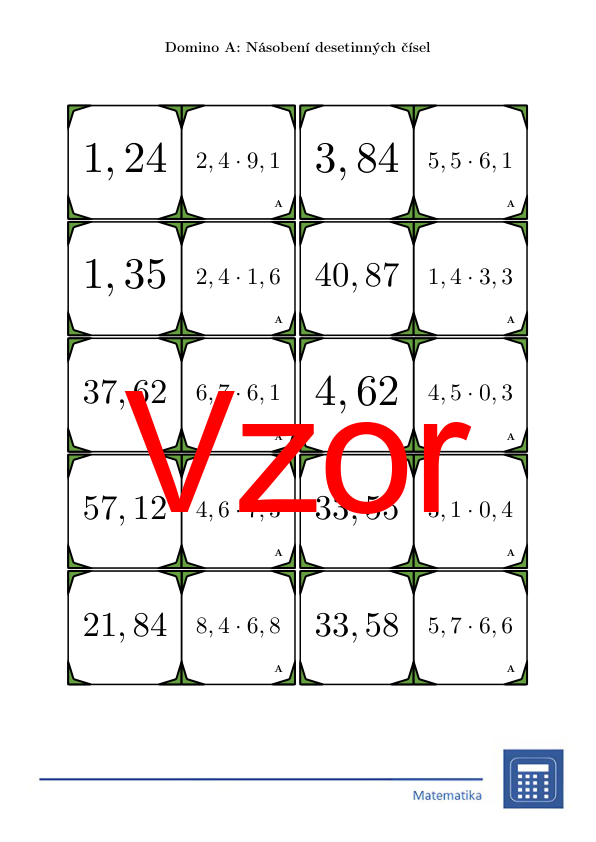 V materiálu se nachází celkem 30 různých sad domin na téma násobení desetinných čísel v následujícím uspořádání:
