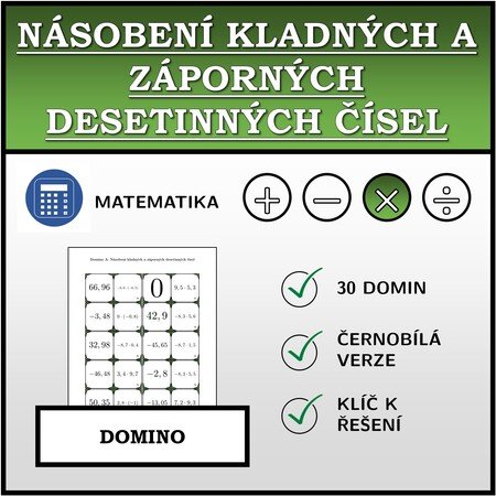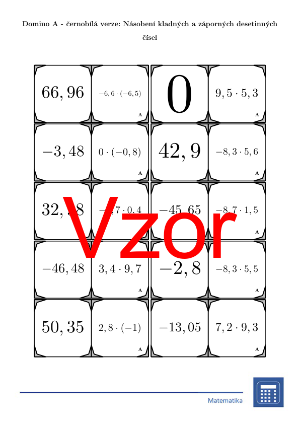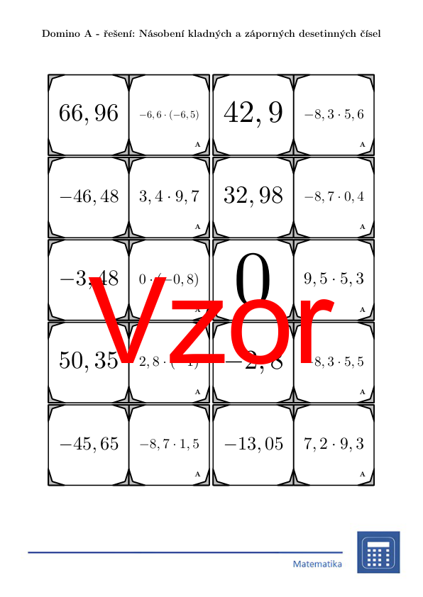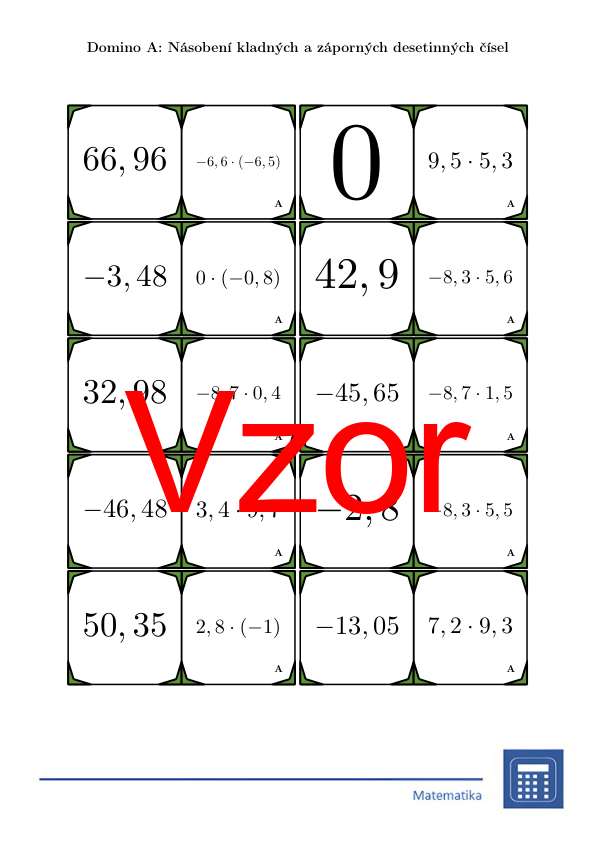 V materiálu se nachází celkem 30 různých sad domin na téma násobení kladných a záporných desetinných čísel v následujícím uspořádání: