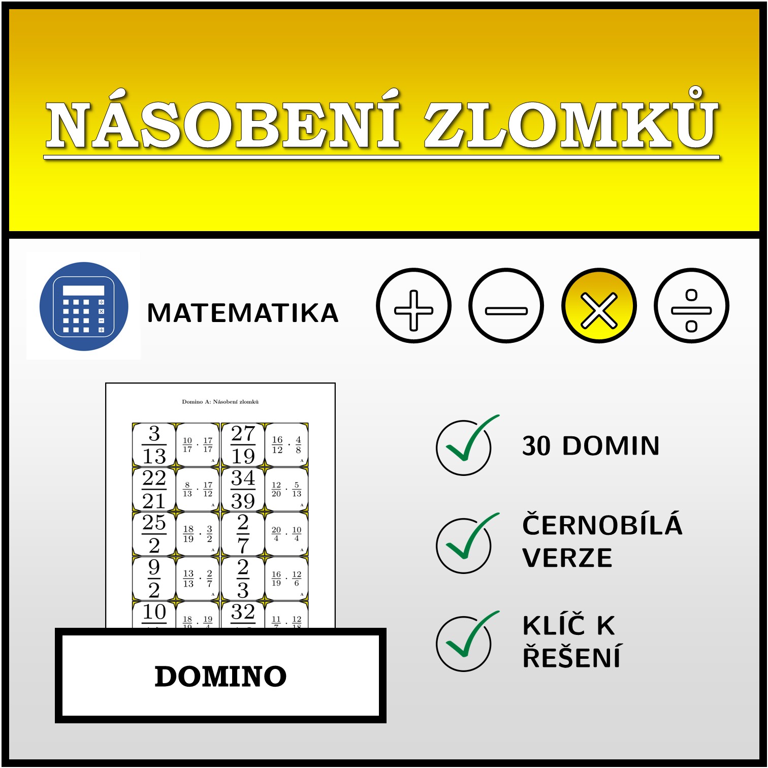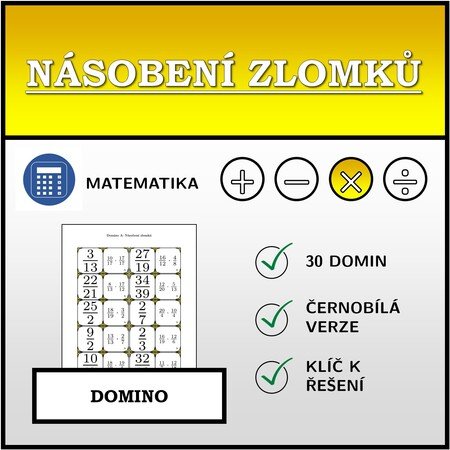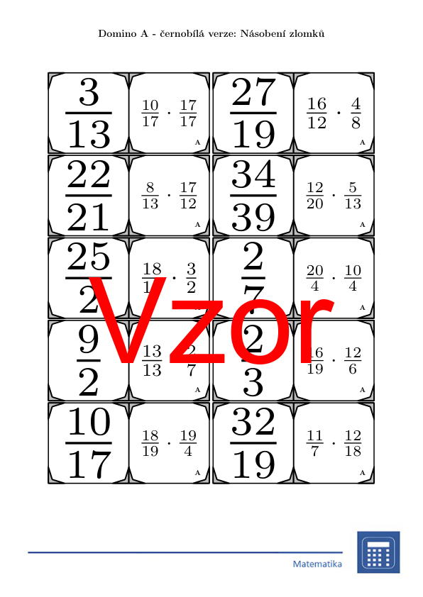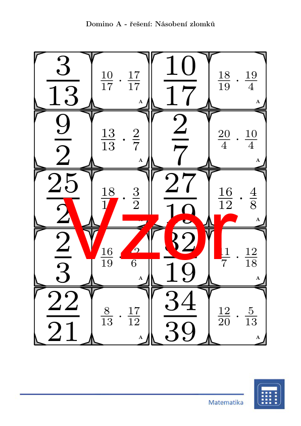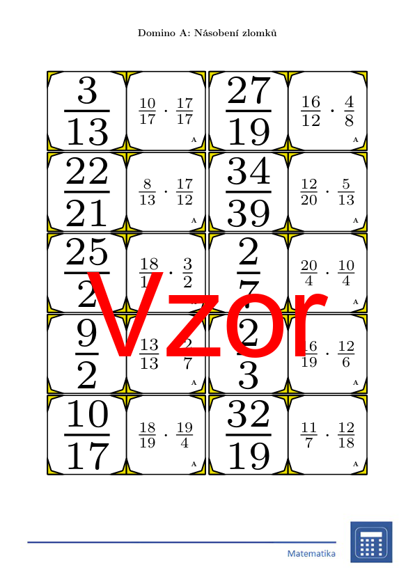V materiálu se nachází celkem 30 různých sad domin na téma násobení zlomků v následujícím uspořádání: