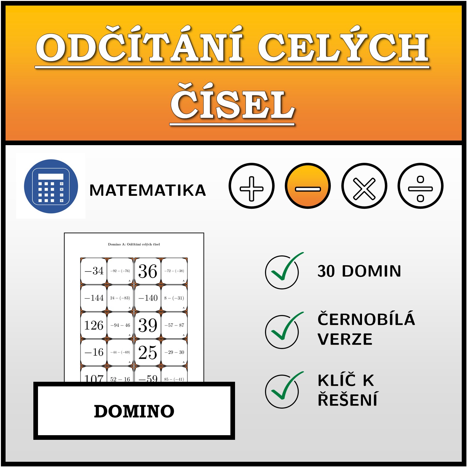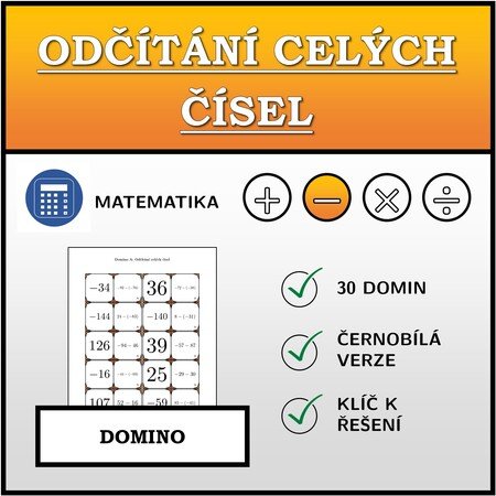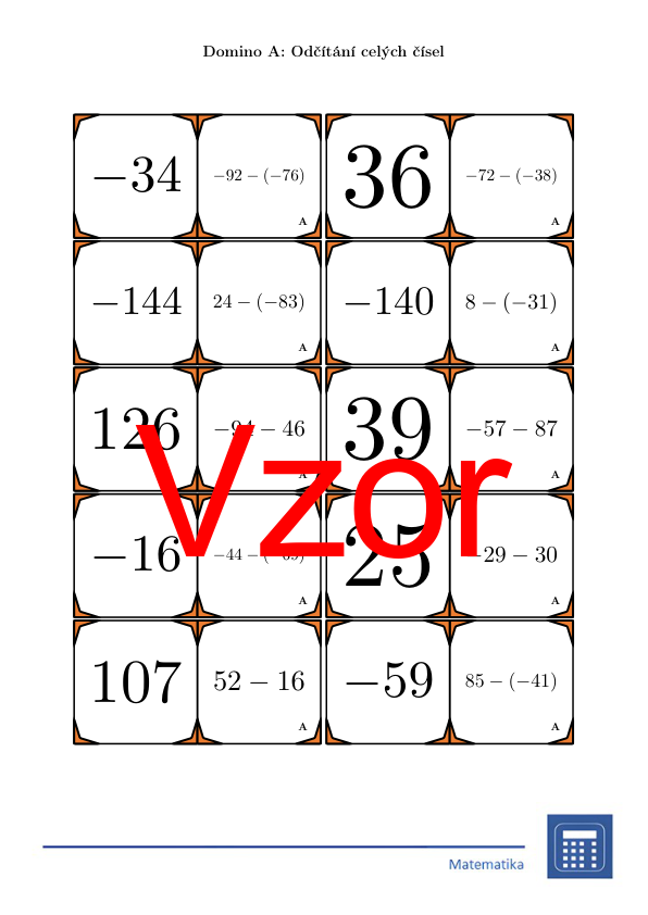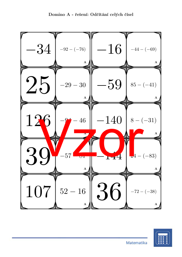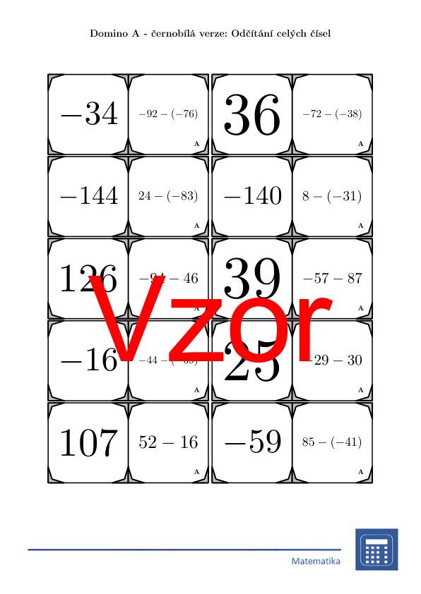 V materiálu se nachází celkem 30 různých sad domin na téma odčítání celých čísel v následujícím uspořádání: