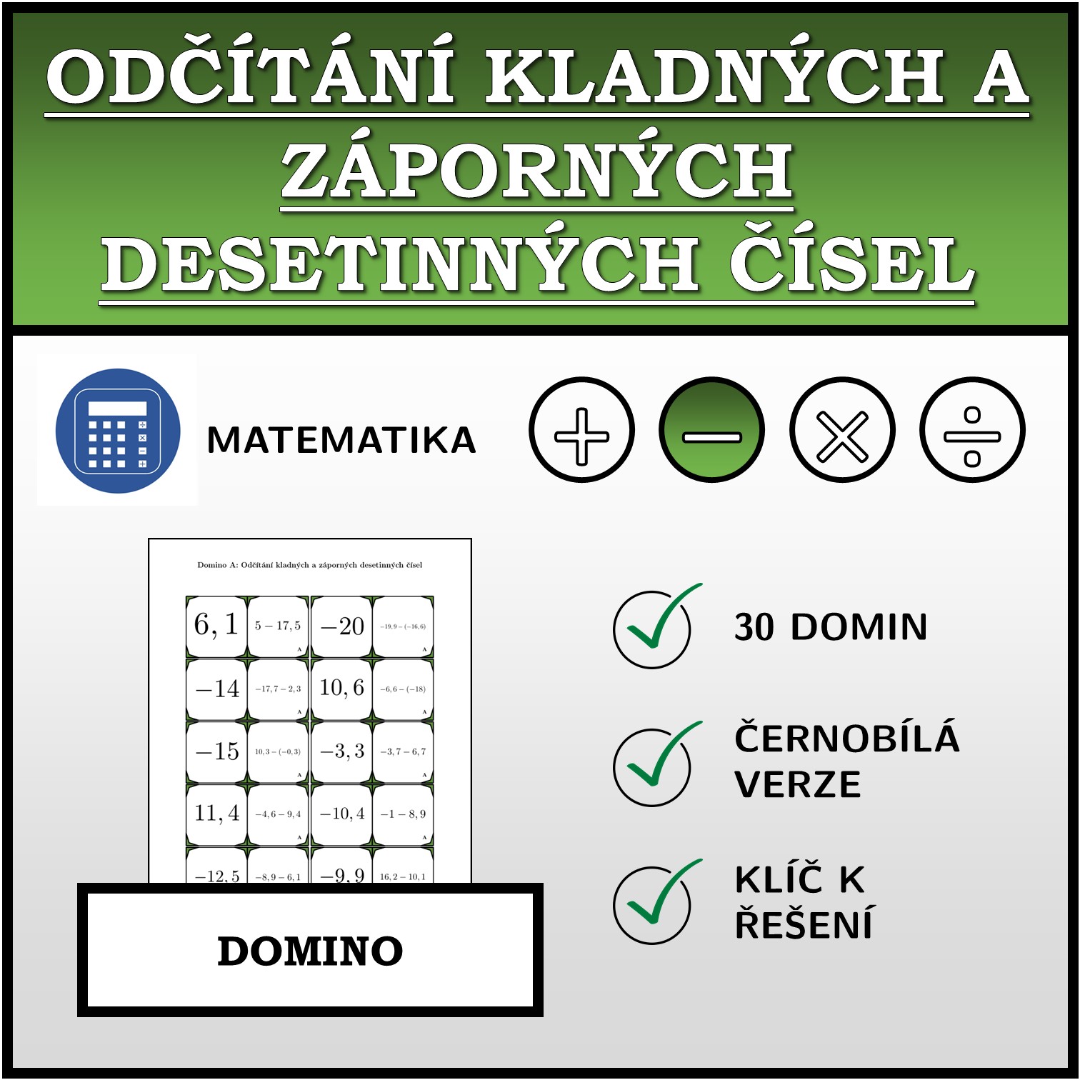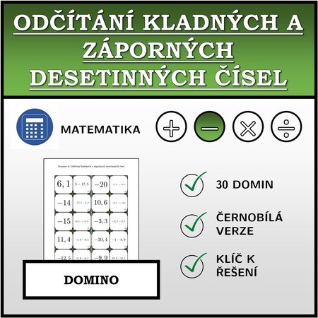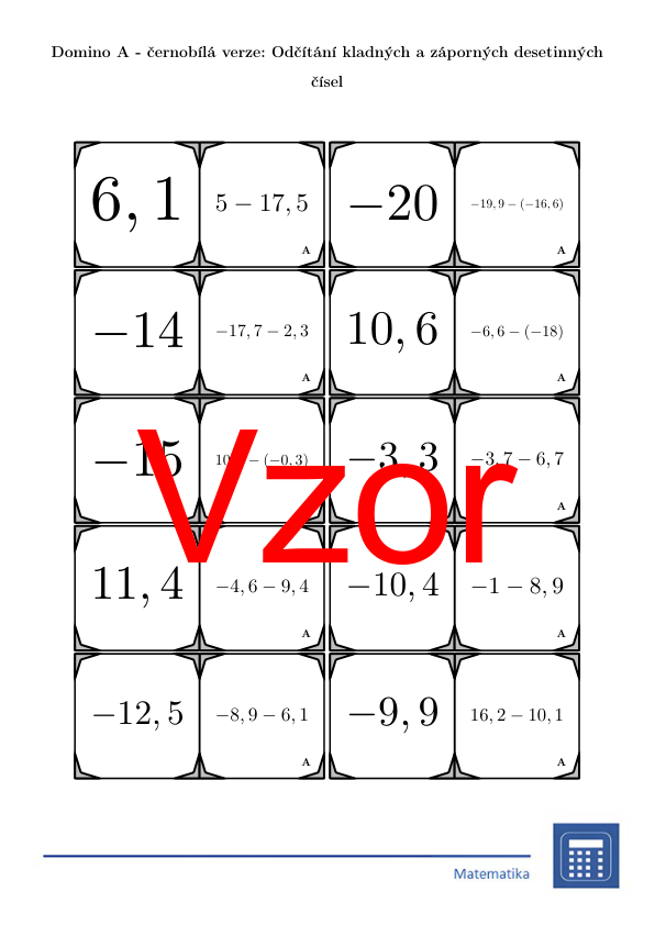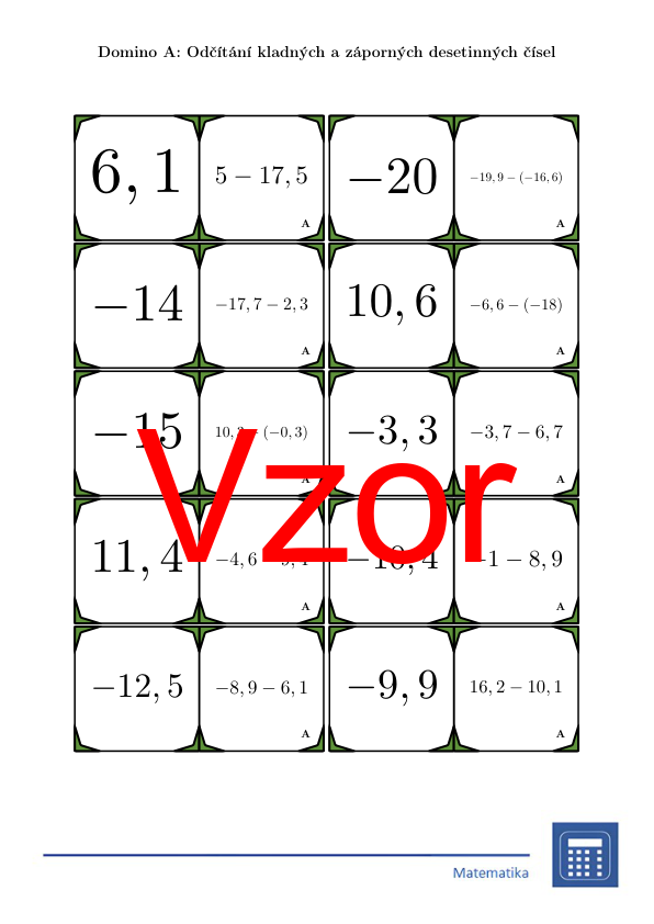 V materiálu se nachází celkem 30 různých sad domin na téma odčítání kladných a záporných desetinných čísel v následujícím uspořádání: