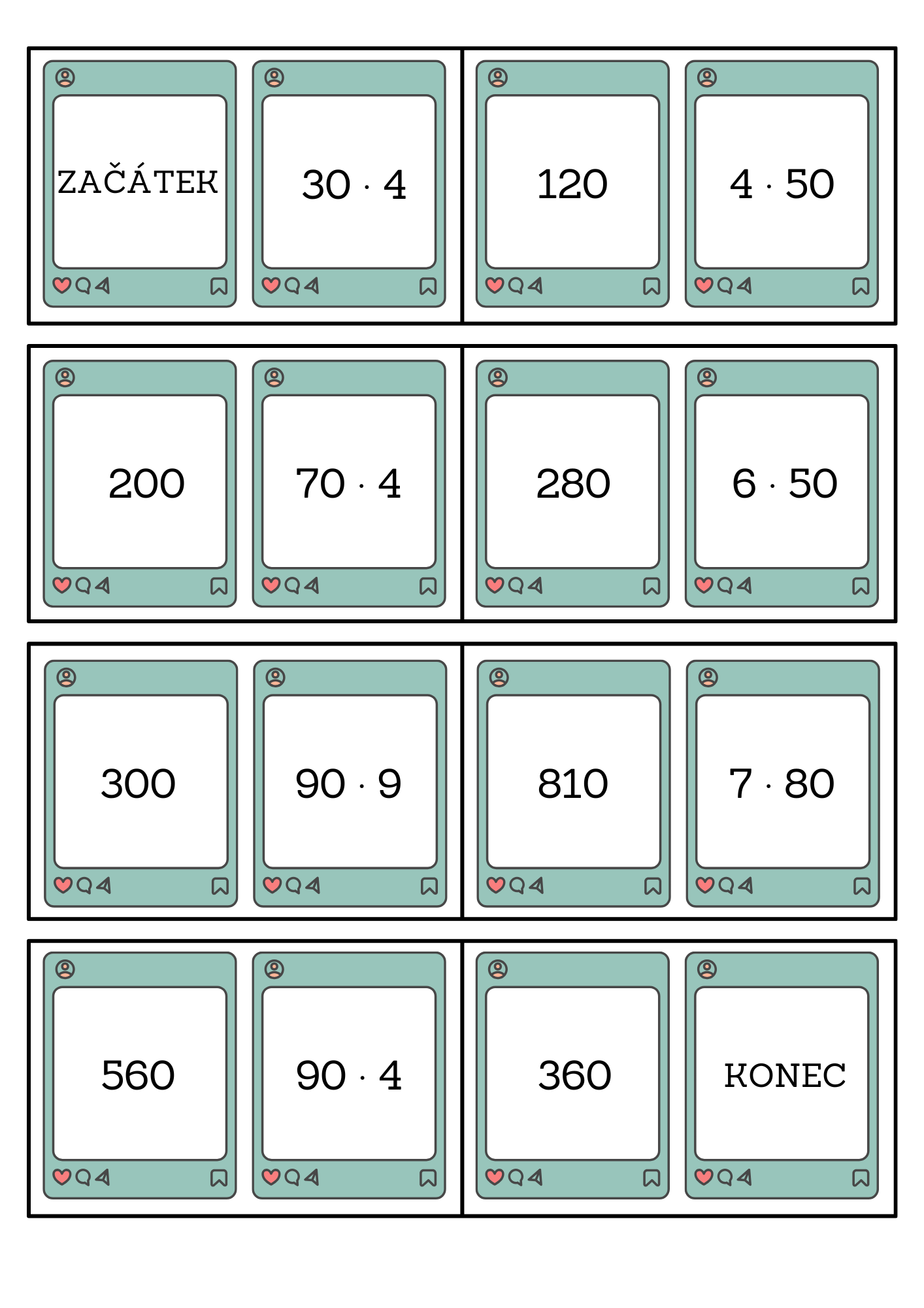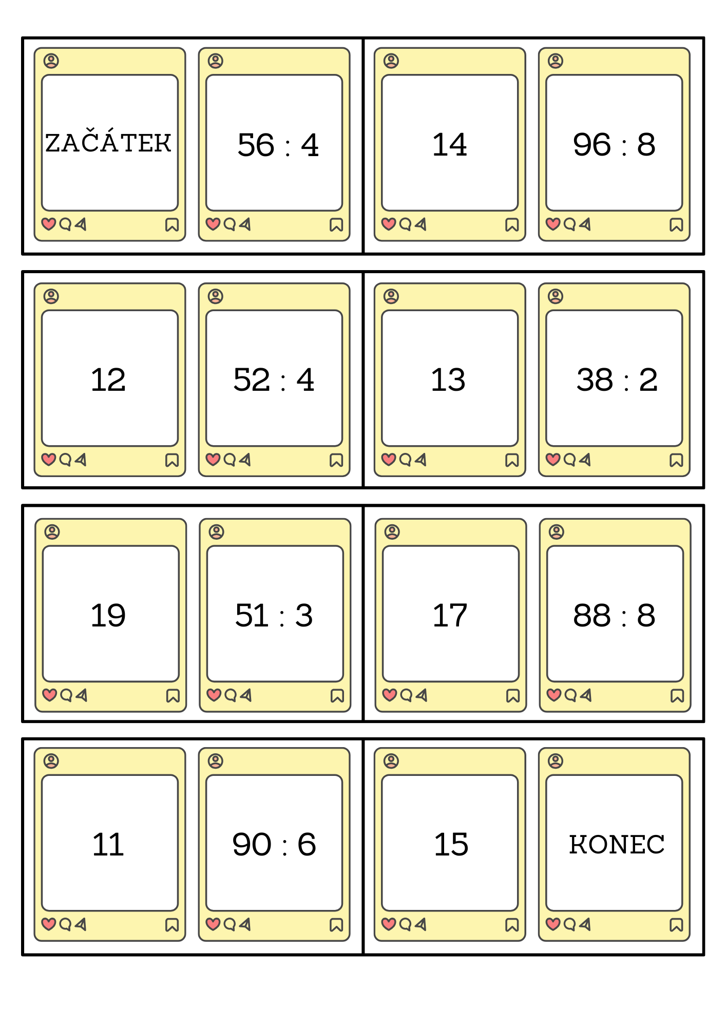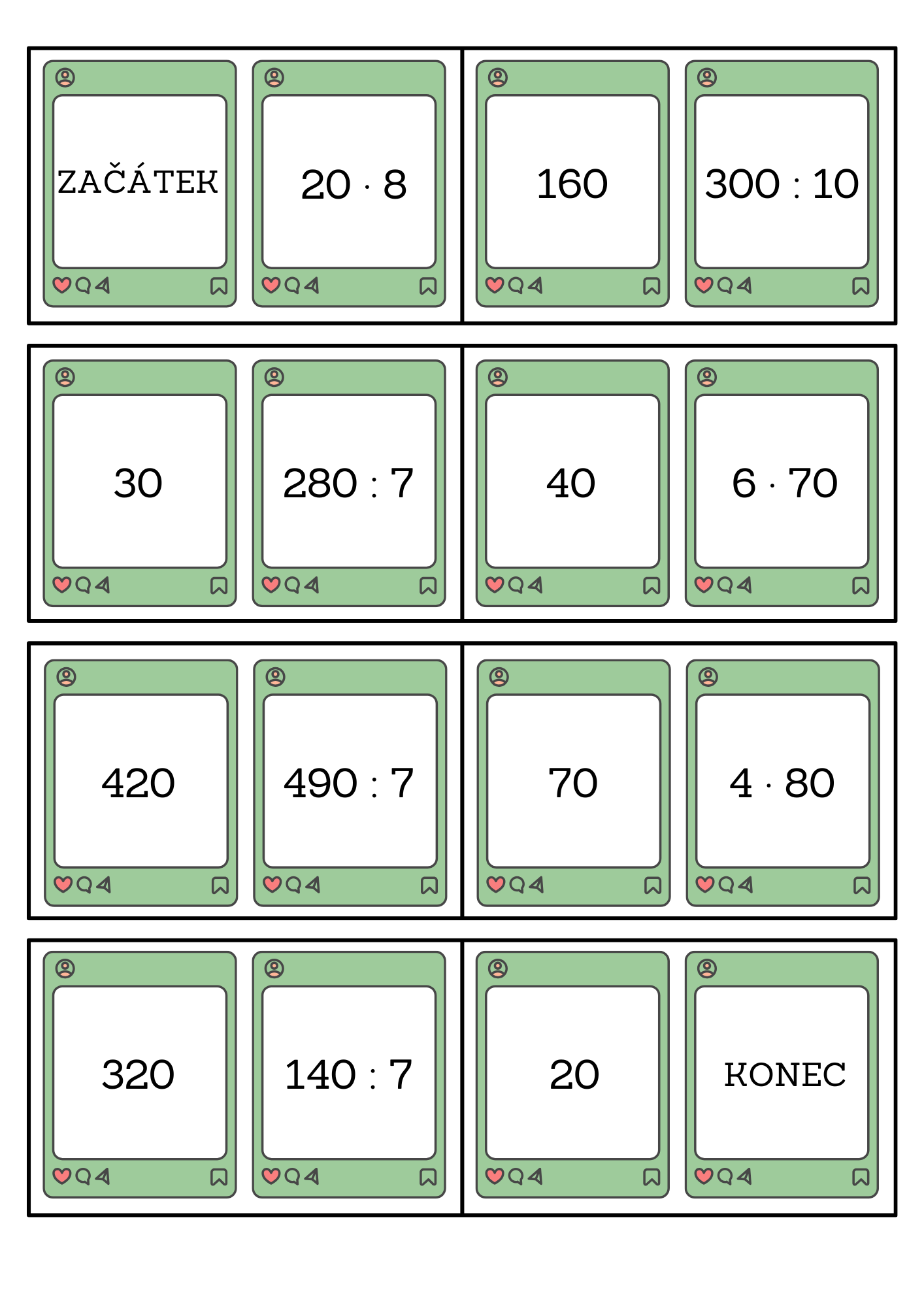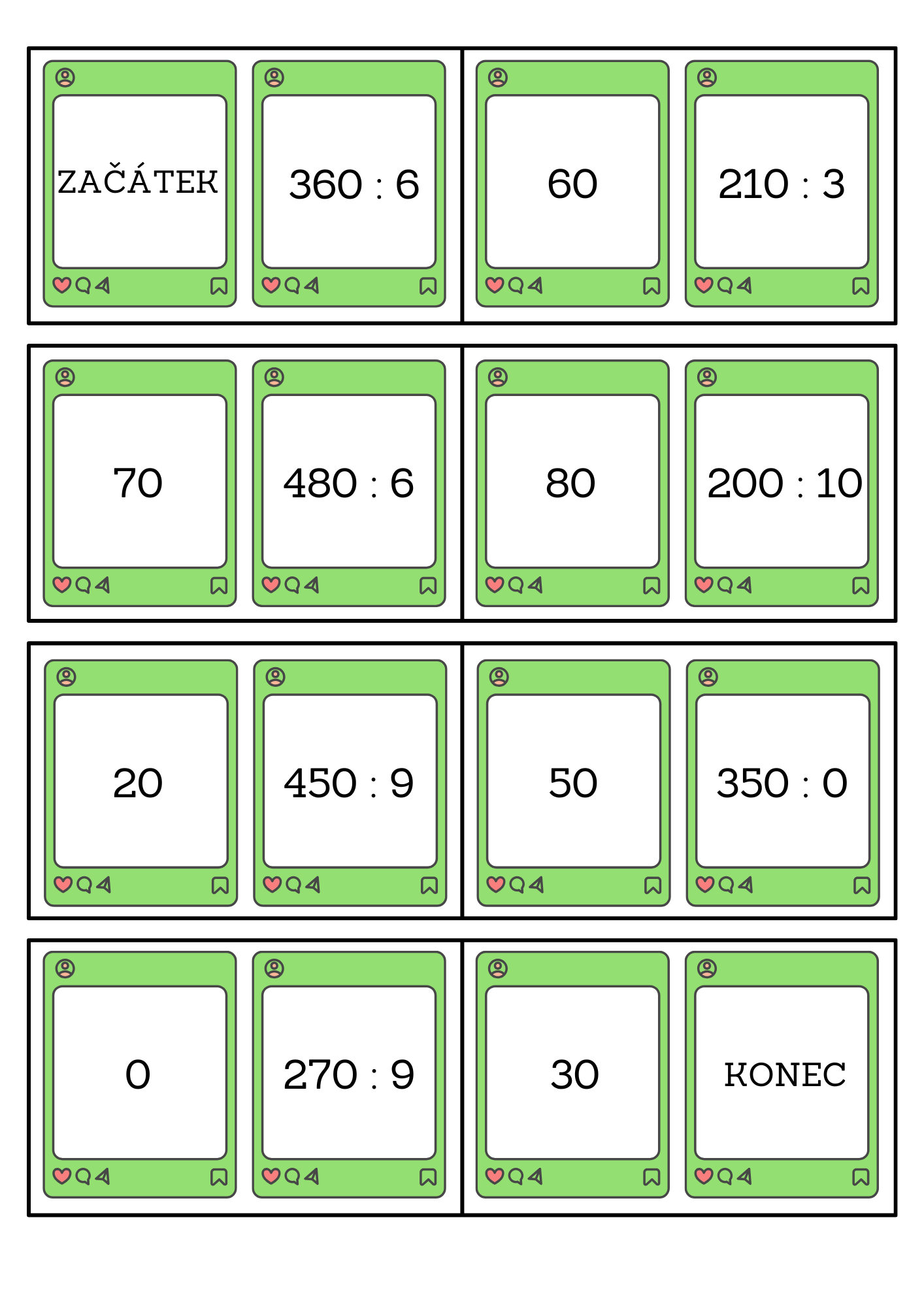 Děti si vezmou kartičku se slovem začátek, vypočítají příklad v pravé části a najdou a přiloží kartičku se správným výsledkem v levé části. Tímto způsobem pokračují až k poslední kartičce se slovem konec.