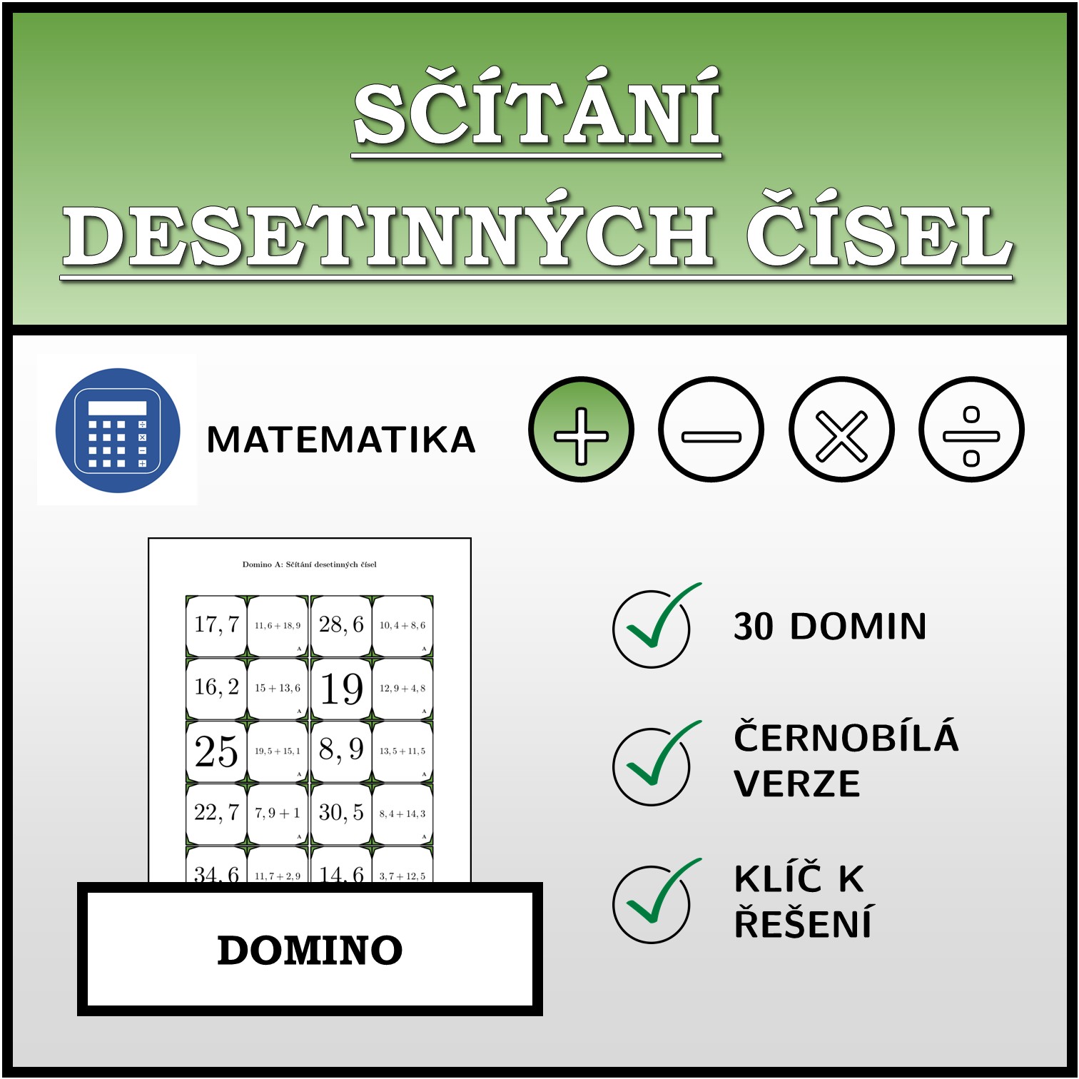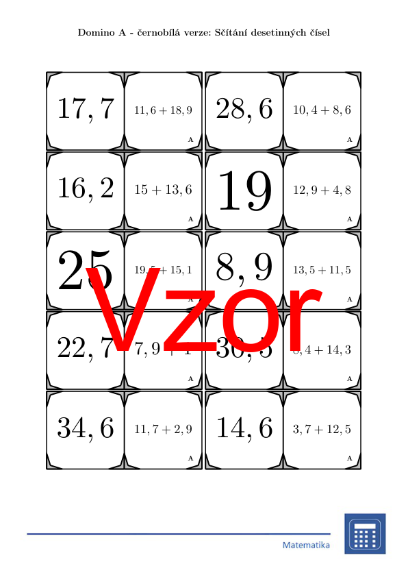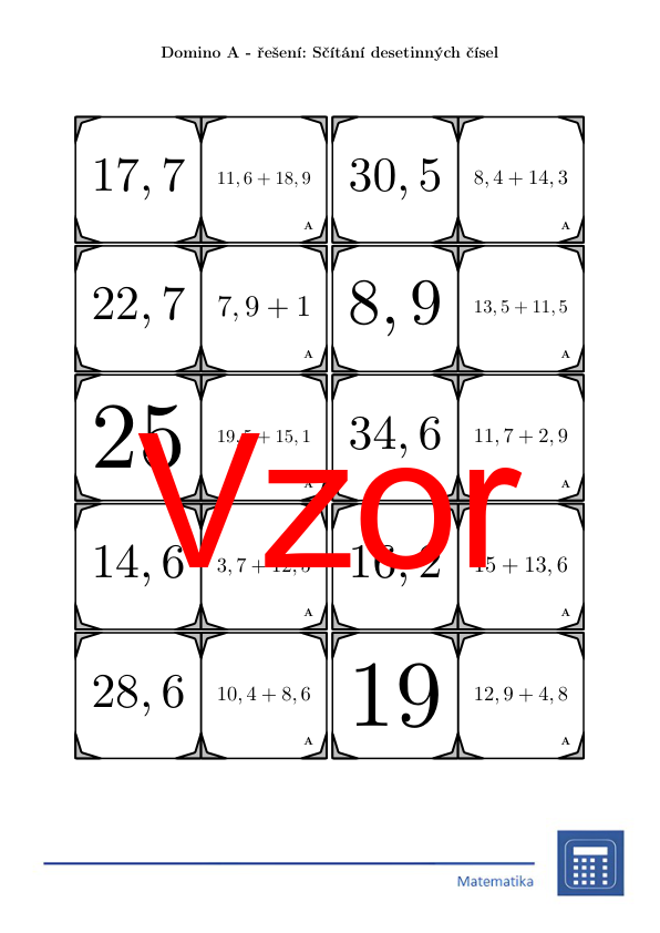 V materiálu se nachází celkem 30 různých sad domin na téma sčítání desetinných čísel v následujícím uspořádání:
