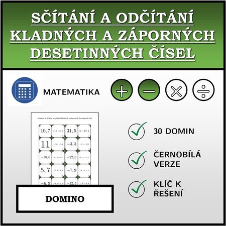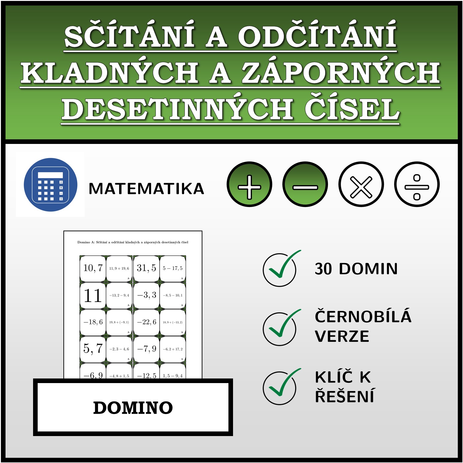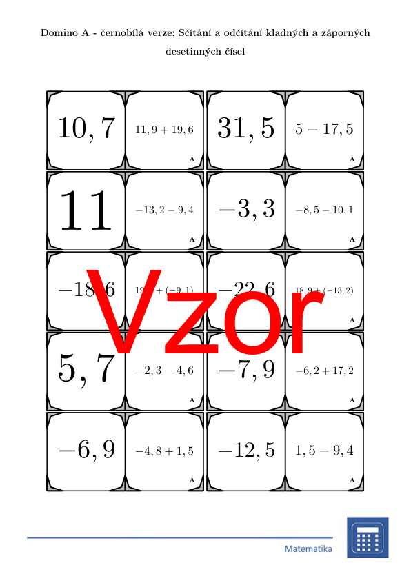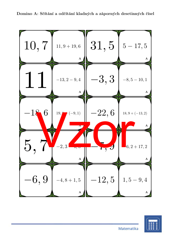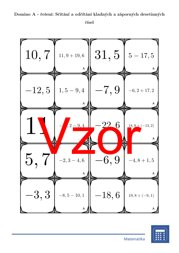 V materiálu se nachází celkem 30 různých sad domin na téma sčítání a odčítání kladných a záporných desetinných čísel v následujícím uspořádání: