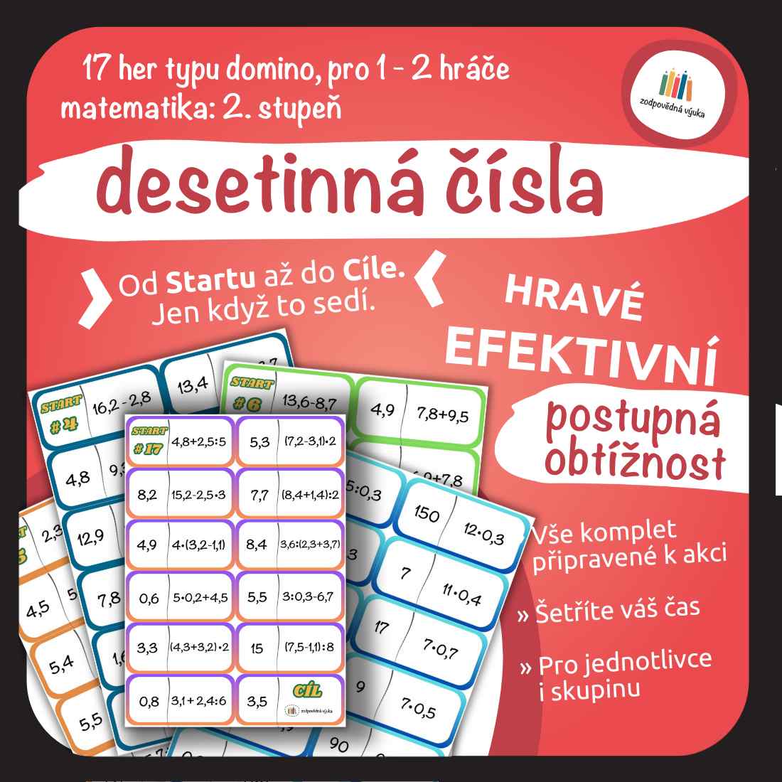 Tahle sada 17 barevných dominových her promění matematiku v dobrodružnou výpravu, kde se děti dostanou od STARTu až do CÍLE jen tehdy, když jim vše správně „klapne“. Procvičí si desetinná čísla pěkně krok za krokem – od jednoduchých příkladů až po ty náročnější. A hlavně: učí se hrou!
