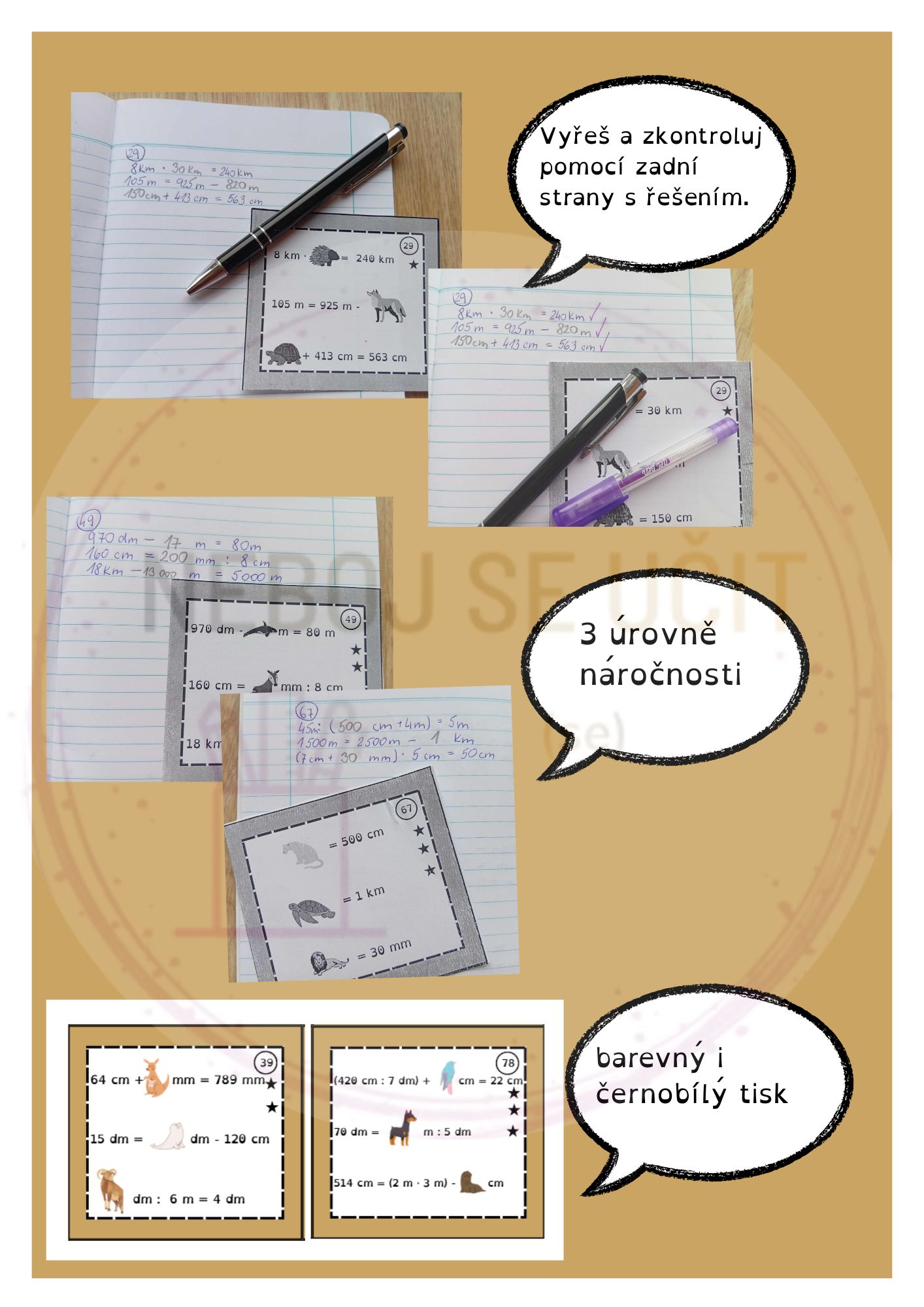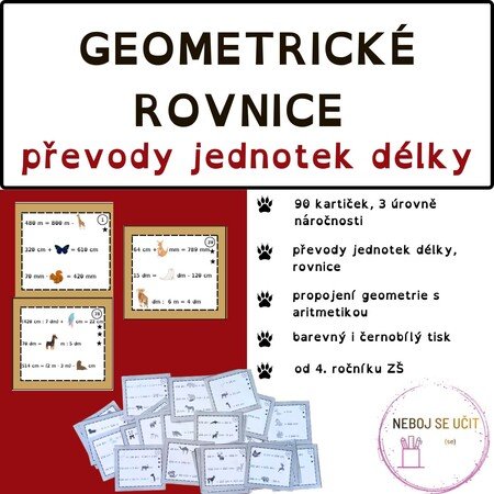 Materiál Geometrické rovnice se v tomto případě zaměřuje na převody jednotek délky. Kombinuje geometrii s aritmetikou, kdy žáci při řešení úloh využívají početní operace, pracují s čísly a navíc operují s jednotkami délky. V souboru naleznete 90 karet, na každé z nich jsou připraveny tři rovnice o jedné neznámé. Tato neznámá je označená obrázkem zvířete. Karty jsou zhotoveny ve třech úrovních náročnosti. Pro každou úroveň je zhotoveno 30 karet. Je tedy na vás a žácích, zda využijete ve výuce jednu vybranou úroveň nebo všechny. Úroveň náročnosti je na kartě označena hvězdičkami. Karty s jednou hvězdičkou představují nejjednodušší úroveň, ve které dominují početní operace a jednotky délky se zde nepřevádí. Střední úroveň je označena dvěma hvězdičkami. Oproti předchozí úrovni zde již dochází k převodům jednotek délky. Nejtěžší úroveň je označena třemi hvězdičkami. Na této úrovni se převádí jednotky a rovnice navíc zahrnují práci se závorkami. Každá z karet má na zadní straně uvedeno správné řešení, tedy jaká hodnota se skrývá pod obrázkovou neznámou. Karty je možné barevně i černobíle vytisknout, jsou využitelné v hodinách matematiky i geometrie. Vhodné jsou pro žáky od 4. ročníku.