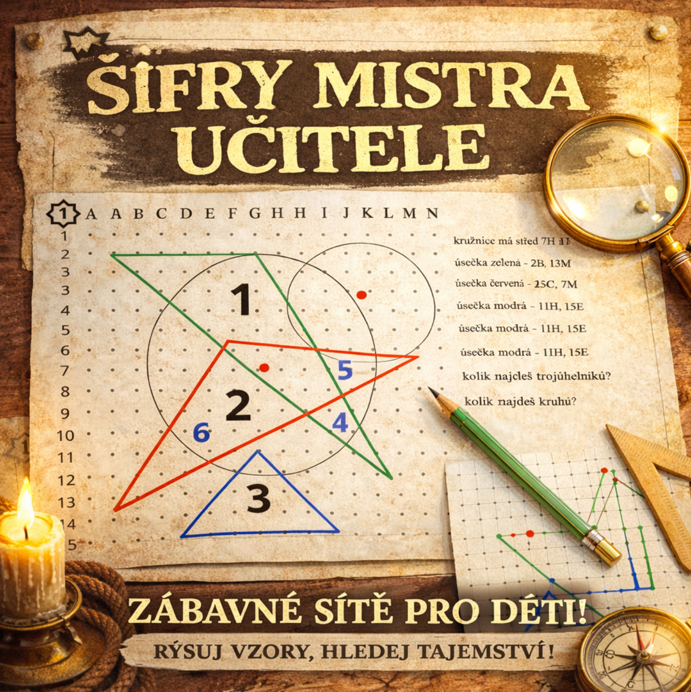 „Šifry mistra učitele“ jsou pracovní listy postavené na jednoduchém principu – děti podle zadání rýsují úsečky a kružnice, propojují body, sledují souřadnice a odhalují různé obrazce. Každý list obsahuje zadání ve formě instrukcí a následné otázky zaměřené na počet trojúhelníků, kružnic, čtverců nebo jiných prvků, které se v obrázku objeví.
