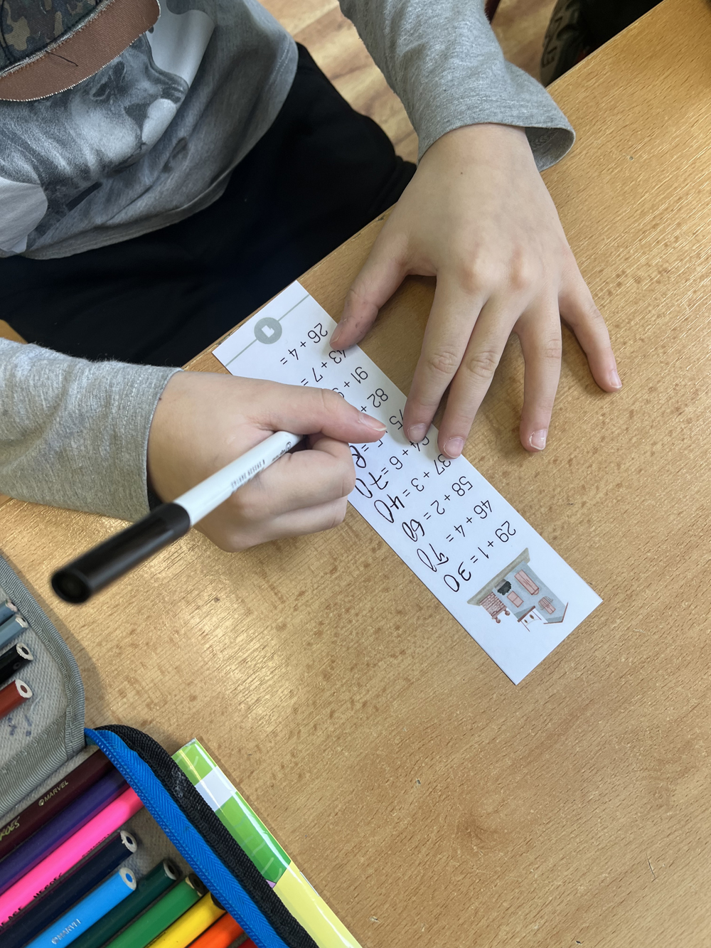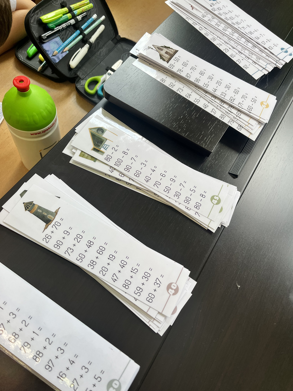 Materiál obsahuje 100 sloupečků v 5 typech příkladů - různé náročnosti. Typy příkladů jsou vyznačené barvou kolečka ve spodní části kartičky. Žáci počítají příklady dle úrovně, kterou si vyberou - správnost vypočítání zkontrolujeme dle listů s řešeními. Mají-li sloupeček bez chyby, vybarví si v pracovním listu obrázek s odpovídajícím číslem.
