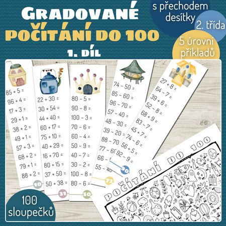 Materiál slouží k procvičování počítání do 100 s přechodem desítky. Obsahuje 5 typů úloh - žák si vybere úroveň, která mu vyhovuje.