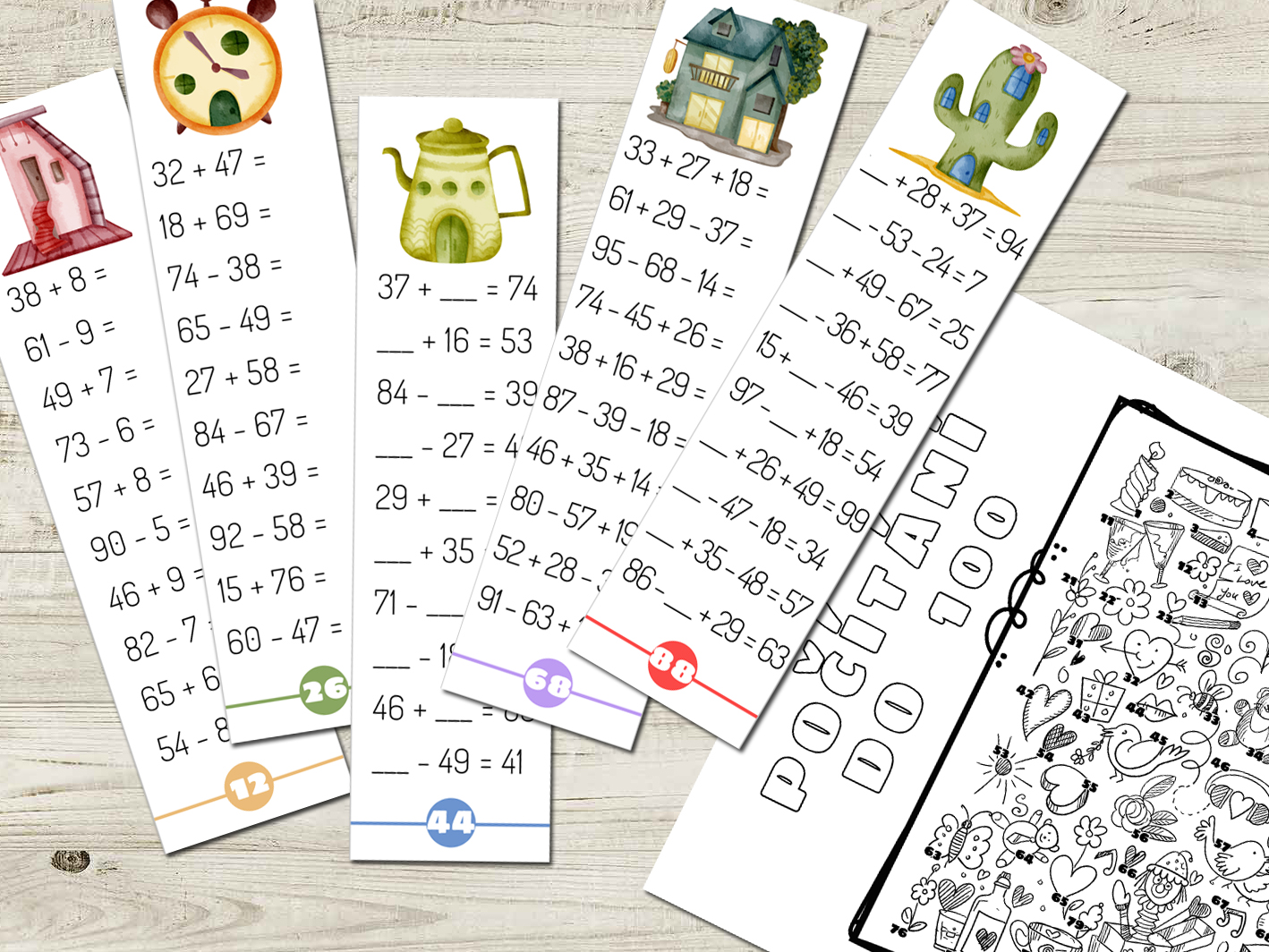 Materiál slouží k procvičování počítání do 100 s přechodem desítky. Obsahuje 9 typů úloh - žák si vybere úroveň, která mu vyhovuje. Jde o sadu 1. a 2. dílu Gradovaného počítání do 100 s přechodem desítky.