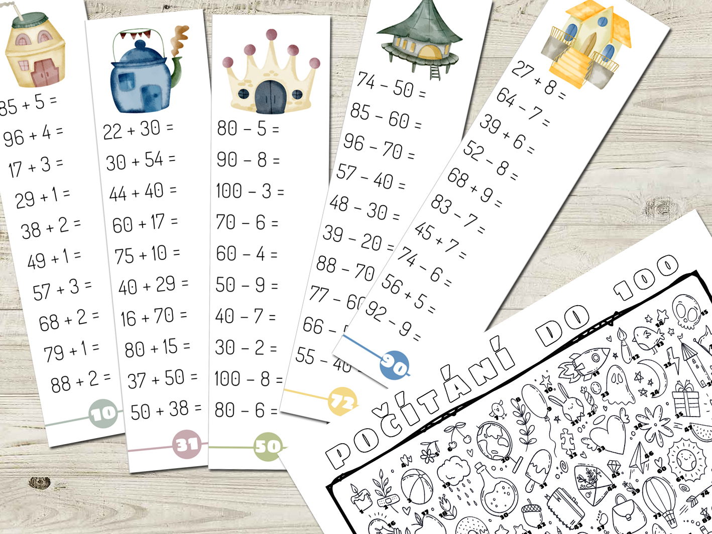 Materiál obsahuje 200 sloupečků v 9typech příkladů - různé náročnosti. Typy příkladů jsou vyznačené barvou kolečka ve spodní části kartičky. Žáci počítají příklady dle úrovně, kterou si vyberou - správnost vypočítání zkontrolujeme dle listů s řešeními. Mají-li sloupeček bez chyby, vybarví si v pracovním listu obrázek s odpovídajícím číslem.