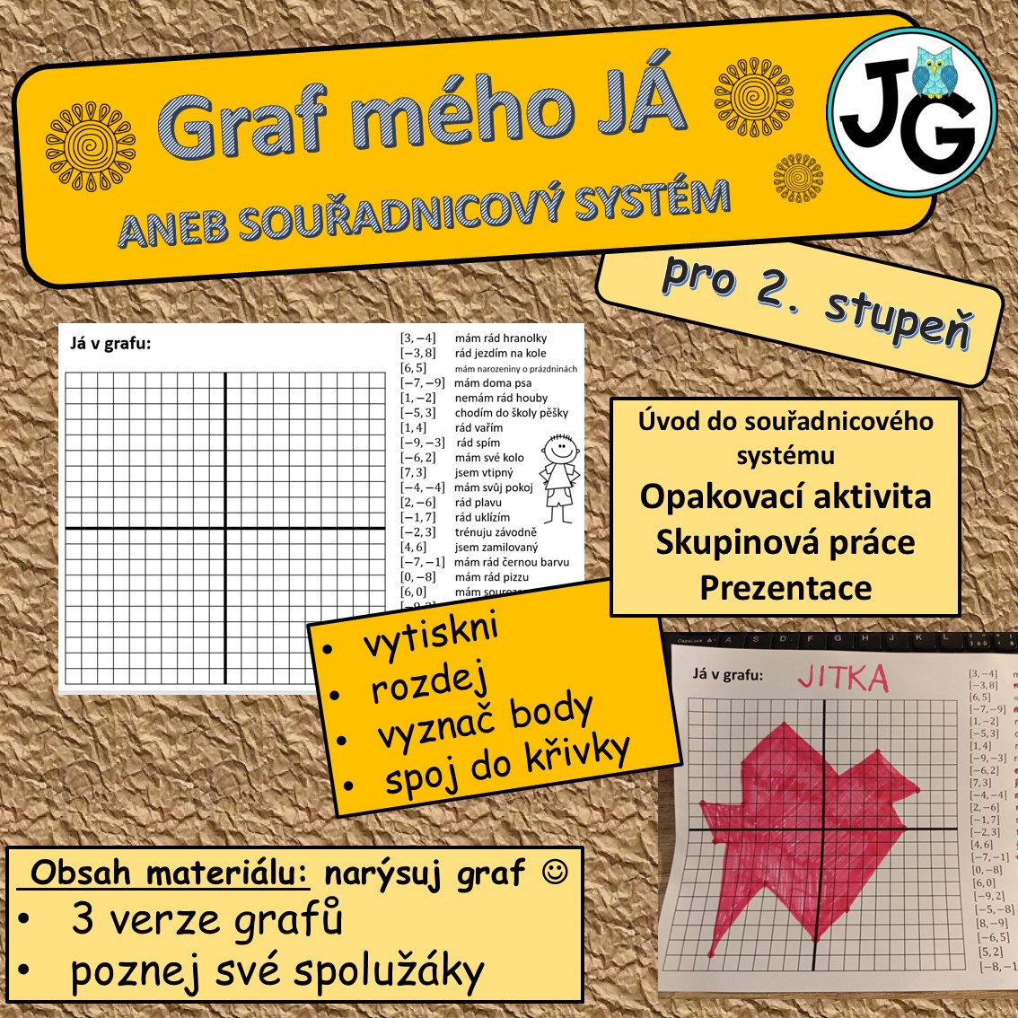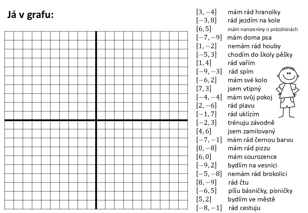 Tento didaktický materiál propojuje výuku geometrie se sebepoznávací a zážitkovou aktivitou. Žáci dostanou pracovní list se souřadnicovým systémem a seznamem vět, které vyjadřují různé vlastnosti, zájmy a životní skutečnosti (např. „ráda jezdím na kole“, „nemám rád houby“, „mám narozeniny o prázdninách“). Každá věta je přiřazena konkrétním souřadnicím. Úkolem žáků je vybrat věty, které na ně platí, a zaznačit odpovídající body do souřadnicového systému. Pokud body postupně spojí, vznikne jedinečná křivka – graf, který symbolicky zobrazuje jejich osobnost.