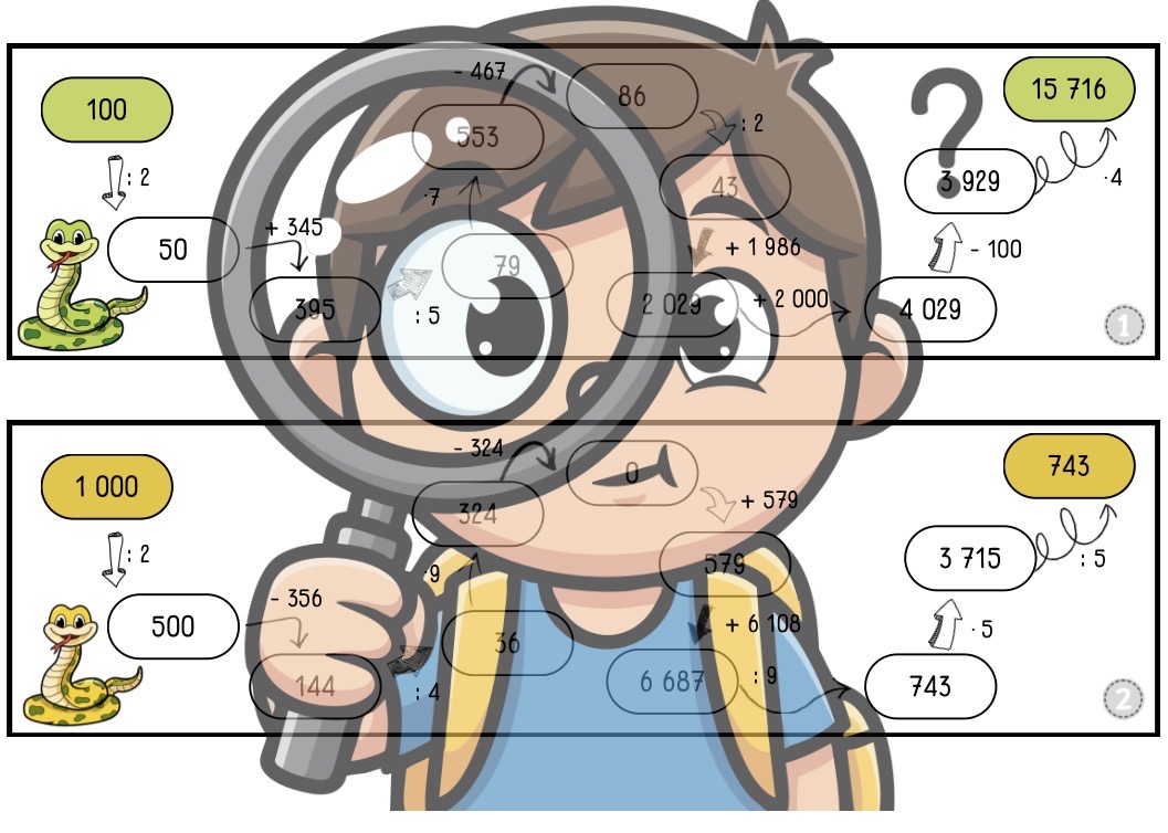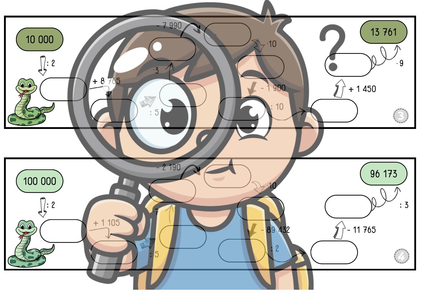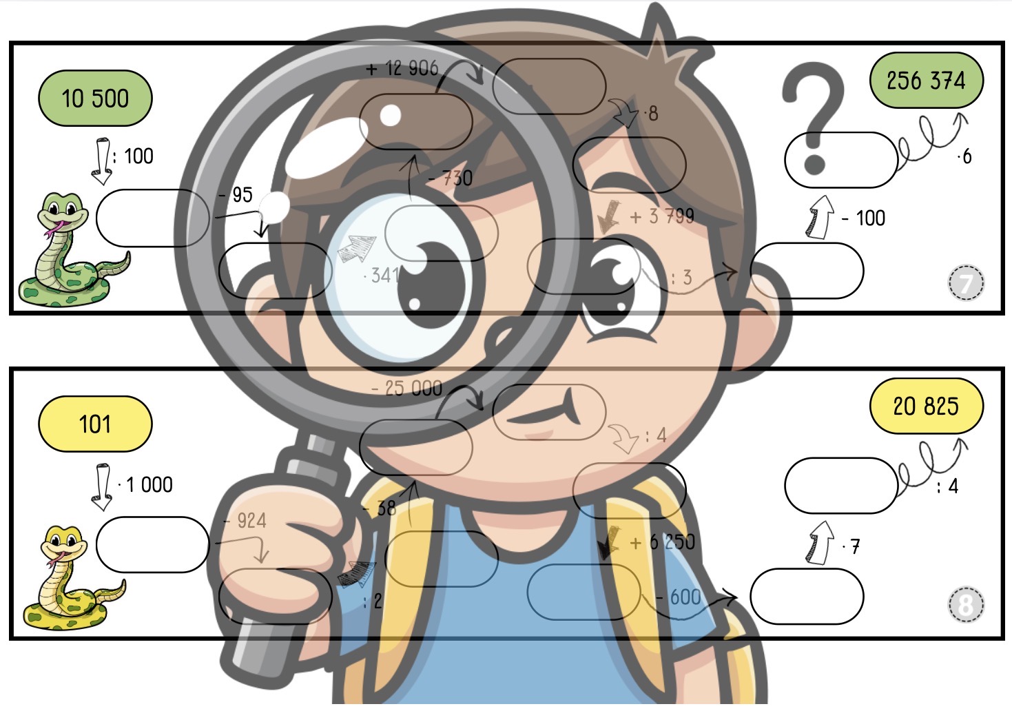 Úkolem žáků je správně doplnit čísla do jednotlivých obdélníků. Jedná se o řetězové příklady, v nichž žák začíná s počátečním číslem a následně postupně provádí početní operace (sčítání, odčítání, násobení nebo dělení) podle šipek. Tímto způsobem pokračuje, dokud nedojde na konec řetězce.