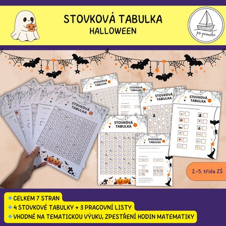 Halloweenský matematický materiál pro zábavné procvičování orientace ve stovkové tabulce. Děti doplňují čísla, která se schovala pod obrázky netopýrů a duchů, určují sousední čísla a odpovídají na otázky typu „Jaké číslo je mezi…?“ nebo „Jaké číslo je za…?“