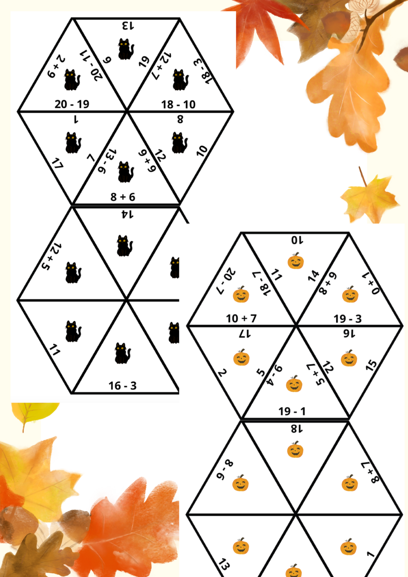 Materiál obsahuje 5 trimin na téma Halloween, které obsahují početní příklady na sčítání a odčítání do 20 s přechodem přes desítku.