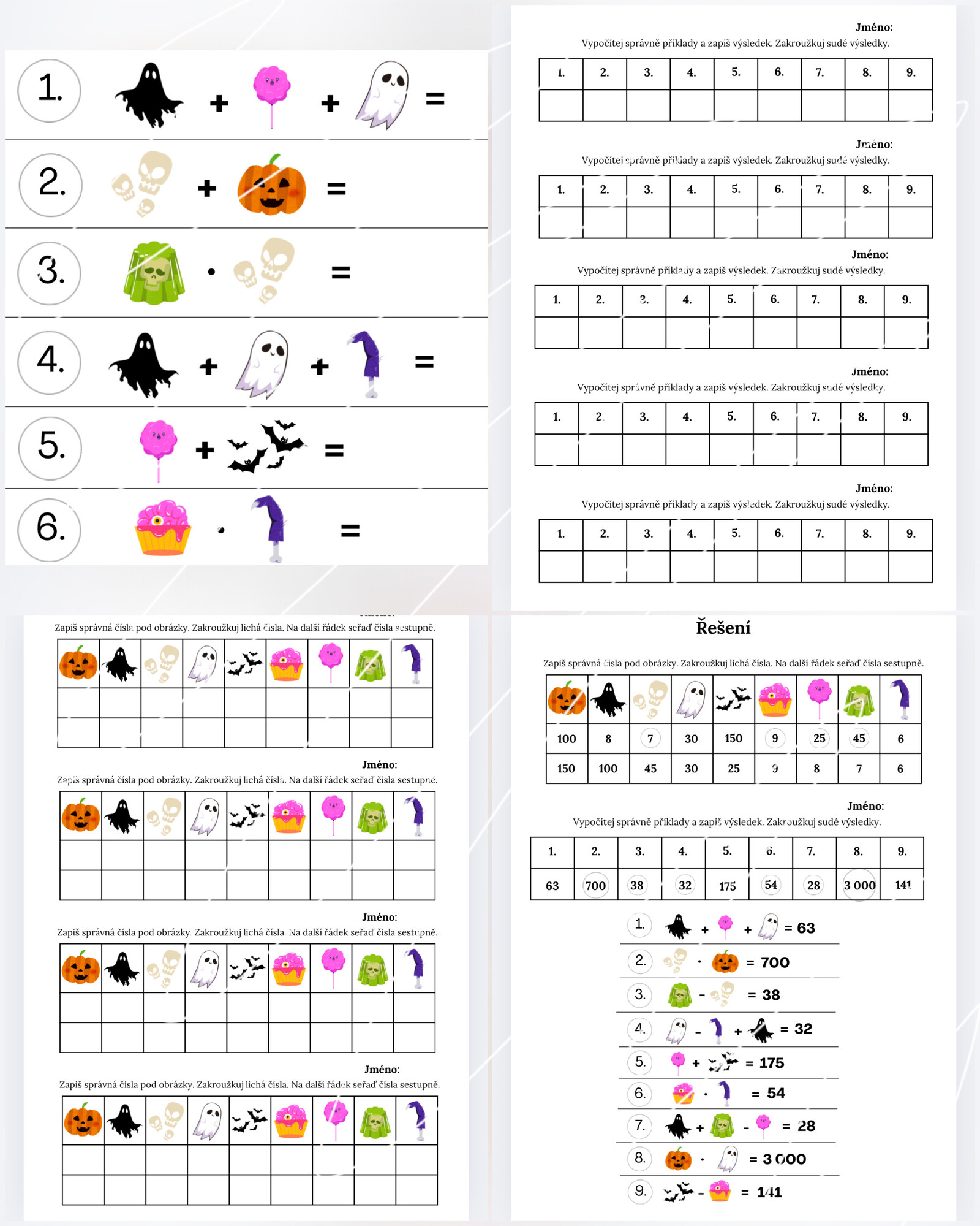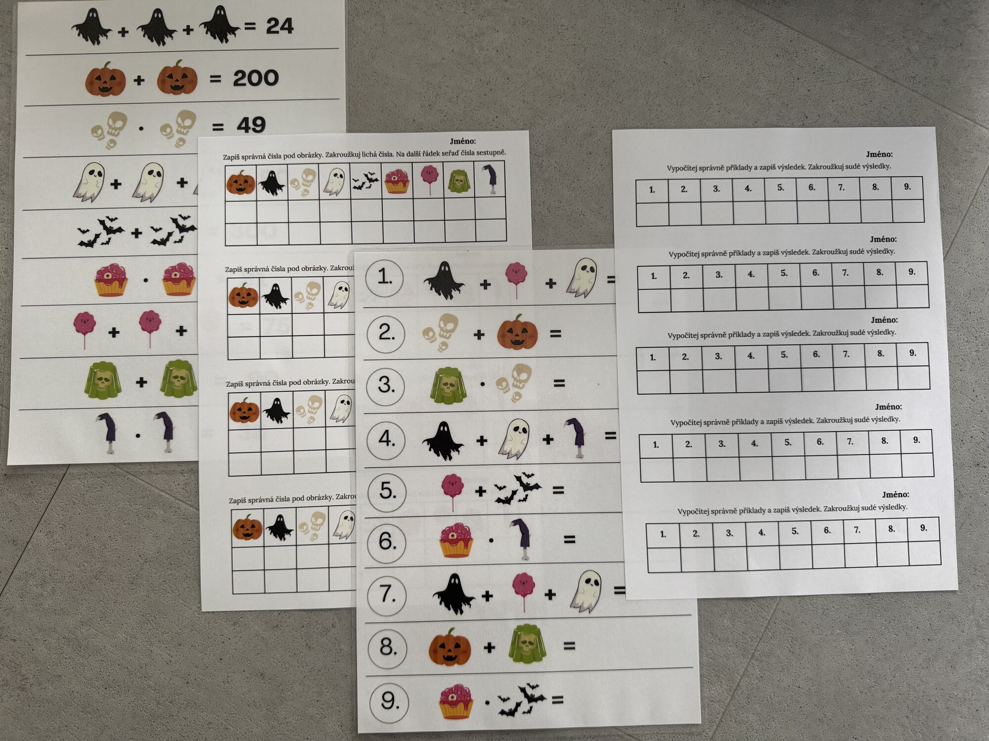 Řeší 9 příkladů, ve kterých jsou místo čísel opět halloweenské symboly.
