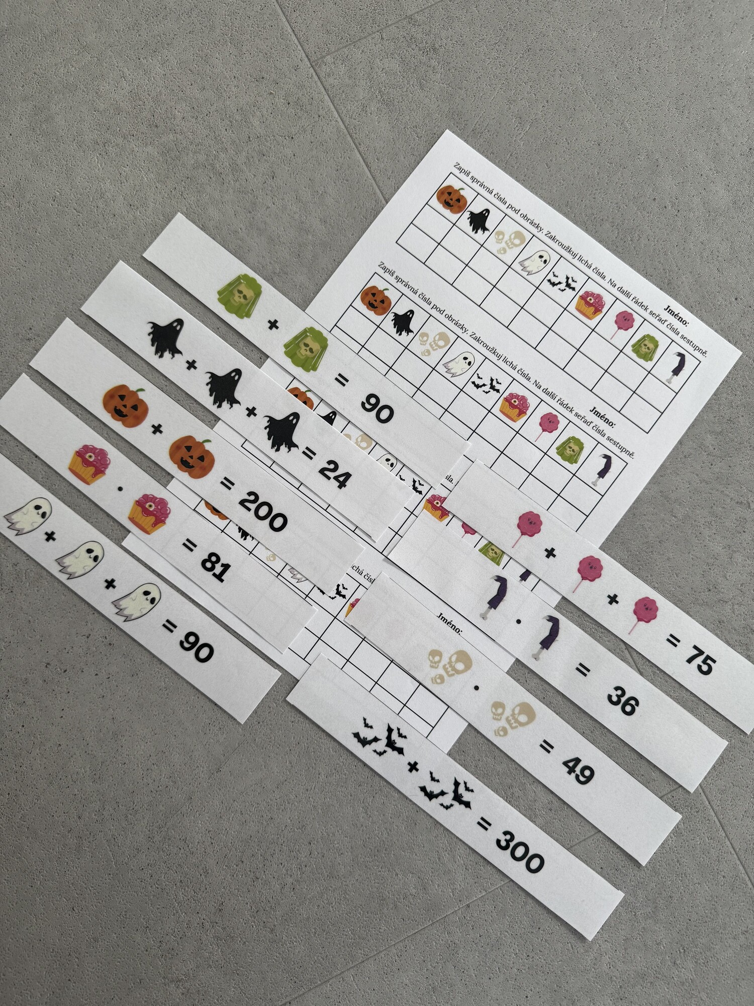 Tato halloweenská matematická aktivita je určena pro žáky jako zábavný úvod k řešení rovnic a práci s neznámou. Pomocí algebrogramů, kde místo čísel vystupují halloweenské obrázky, žáci logicky odvozují, jaké číslo jednotlivé obrázky představují.