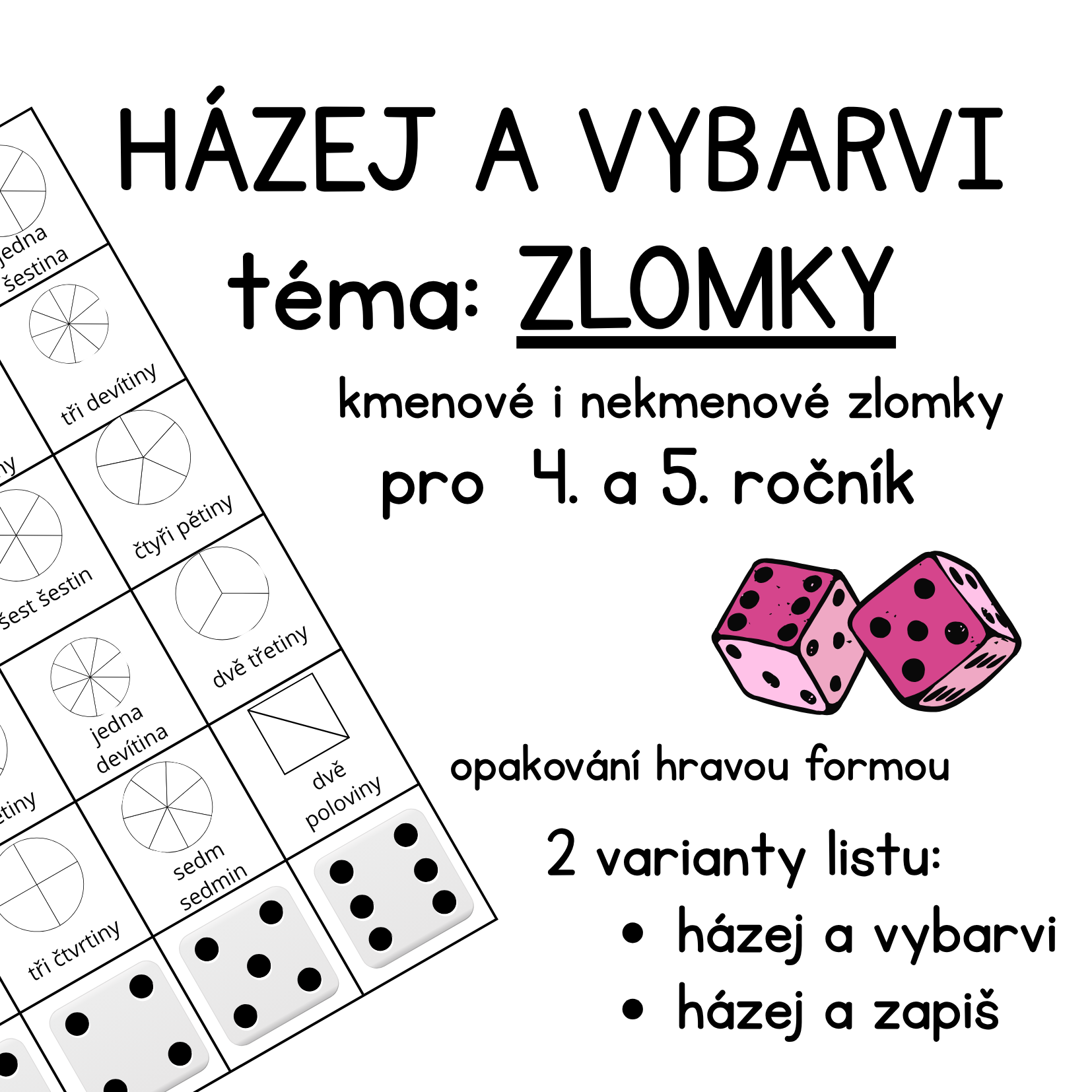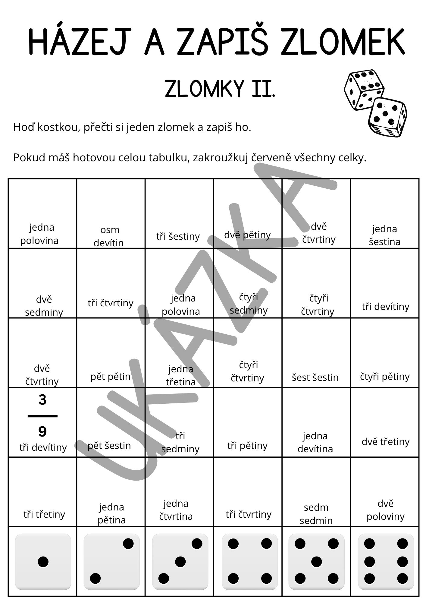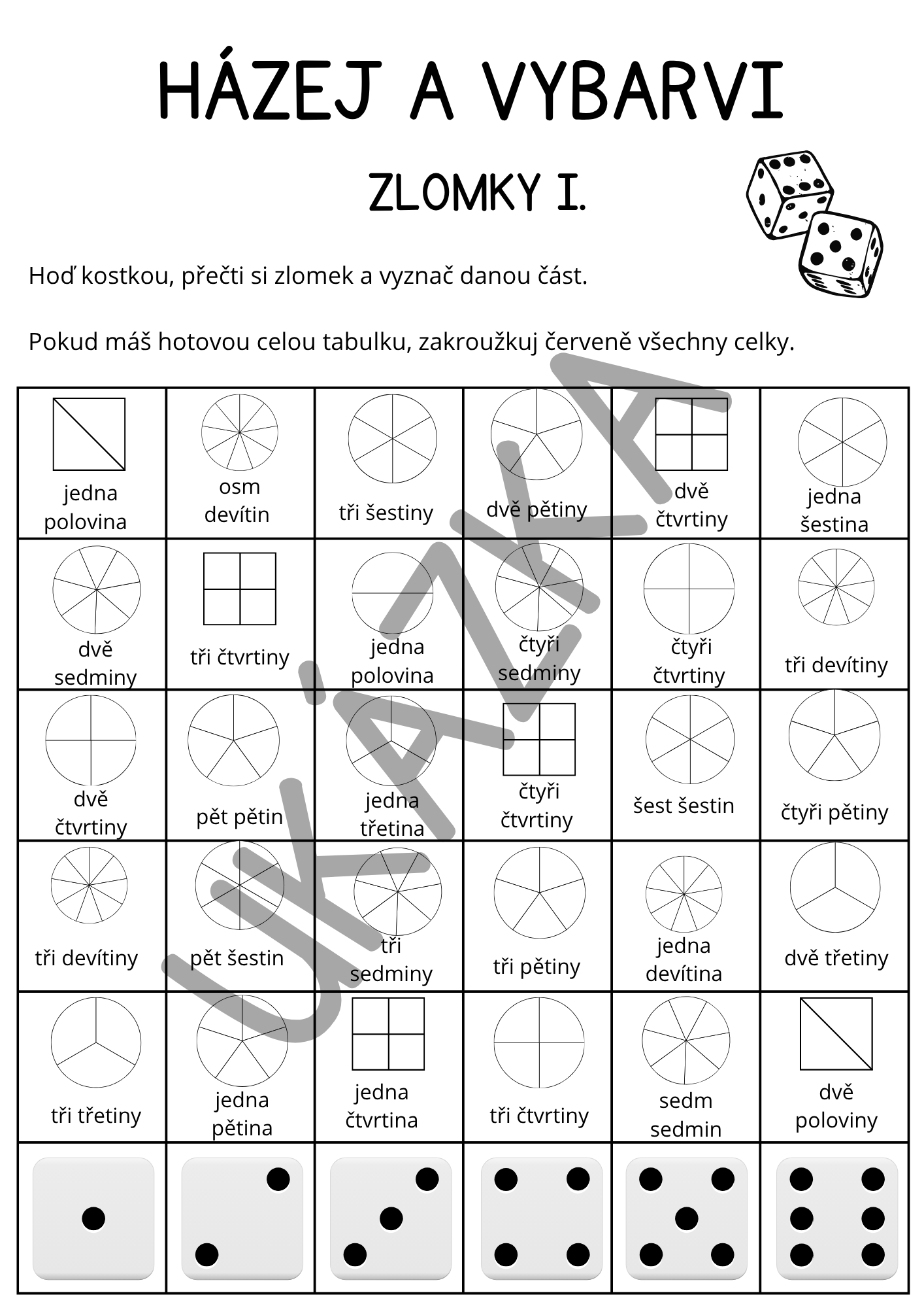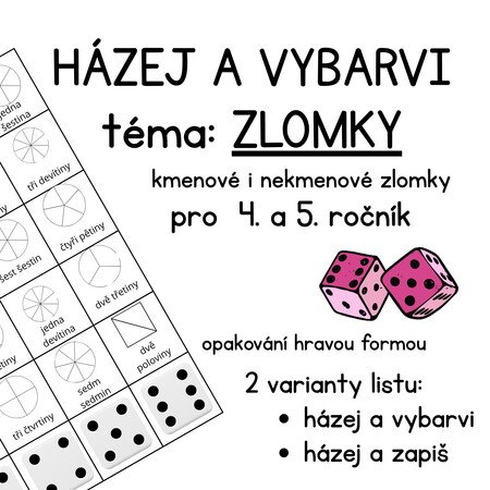 Materiál obsahuje dva pracovní listy, které se zaměřují na procvičování zlomků formou hry s kostkou. Pro rychlejší žáky je na listu extra úkol.