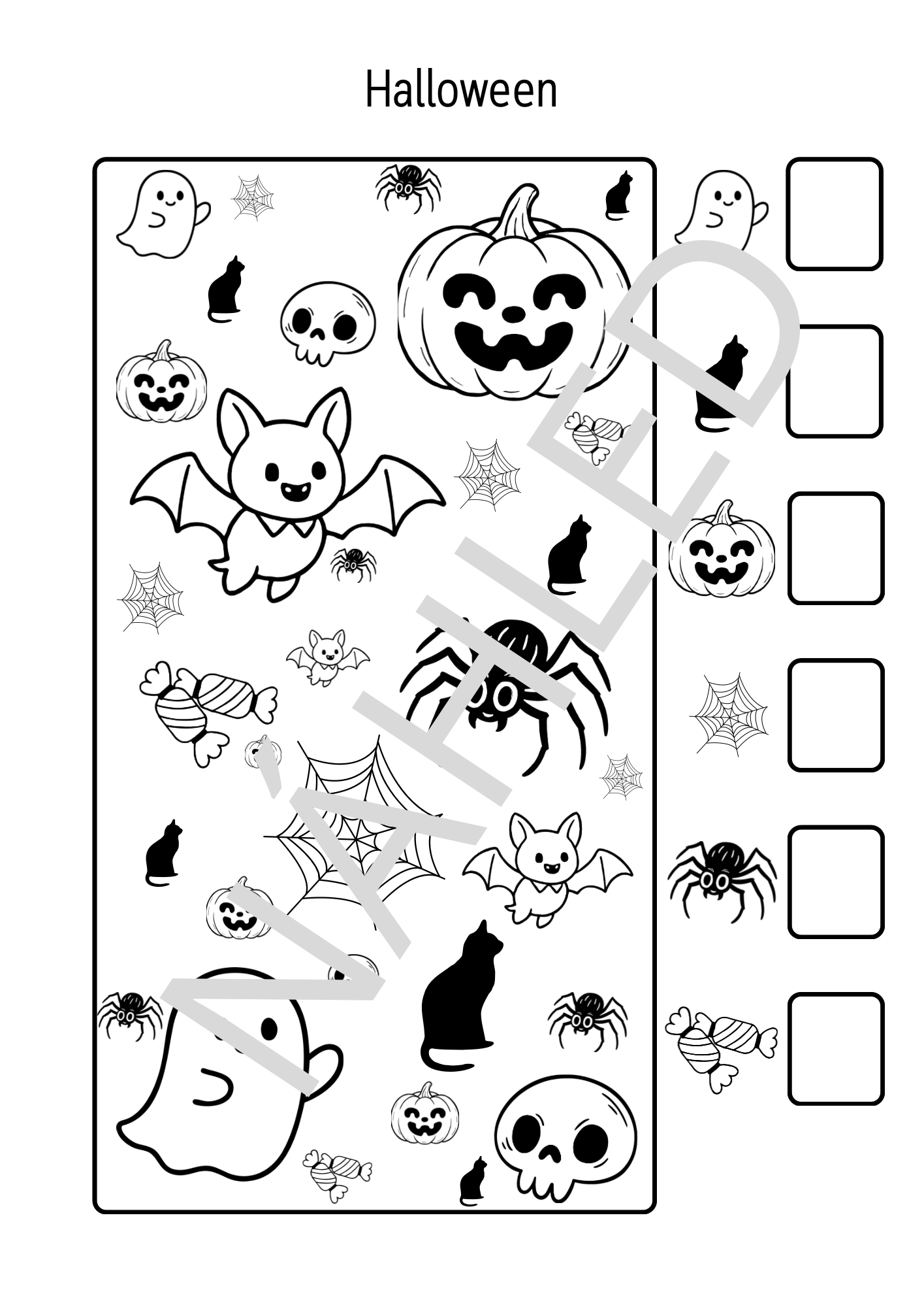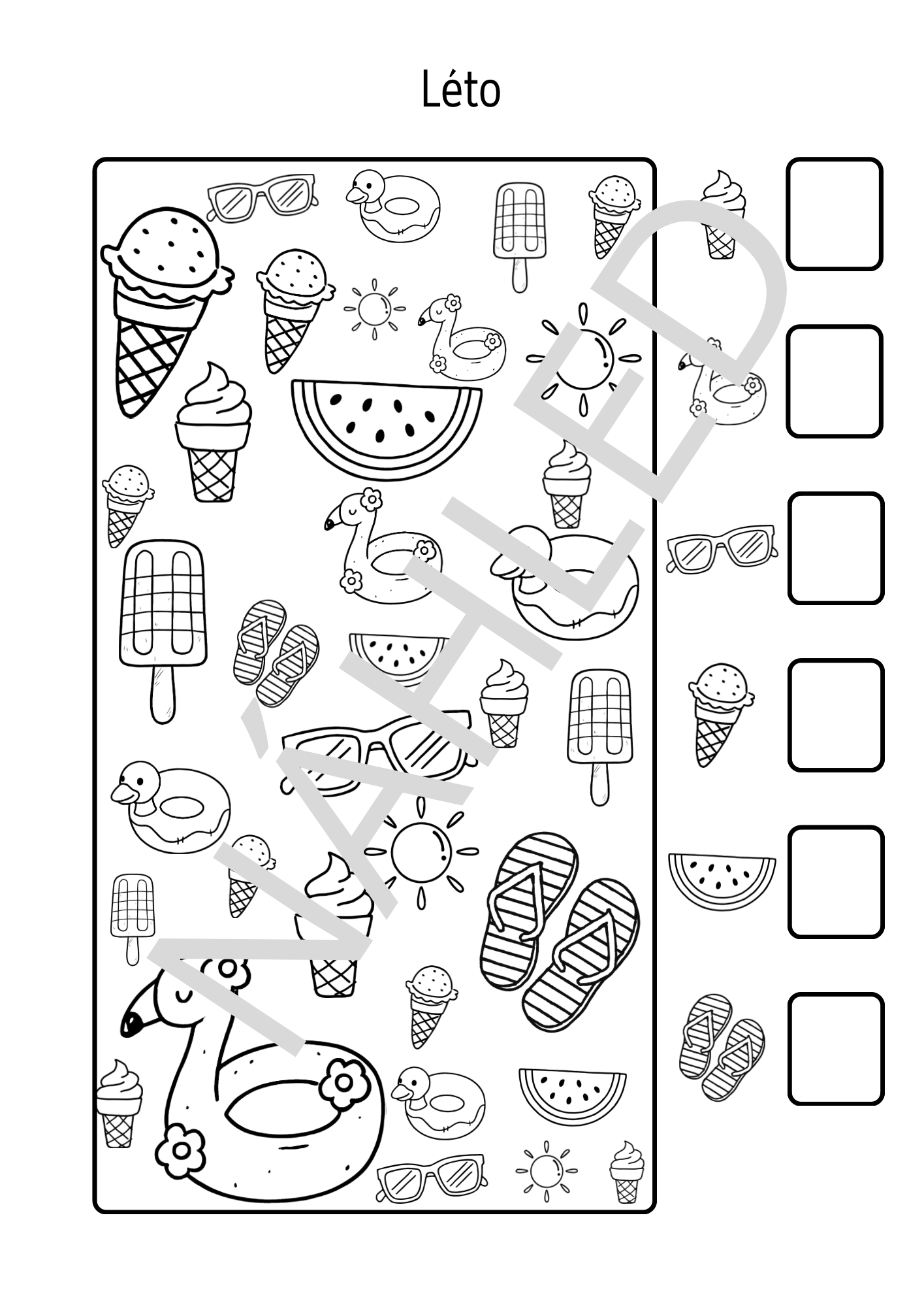 Návod: děti hledají ve velkém obdélníku předměty, které jsou na pravé straně pracovního listu a jejich počet zapíší do čtverce vedle. Počet předmětů mohou zapsat pomocí číslic nebo smbolů (např. tečky). Nalezené předměty si mohou děti kroužkovat nebo třeba vybarvit.