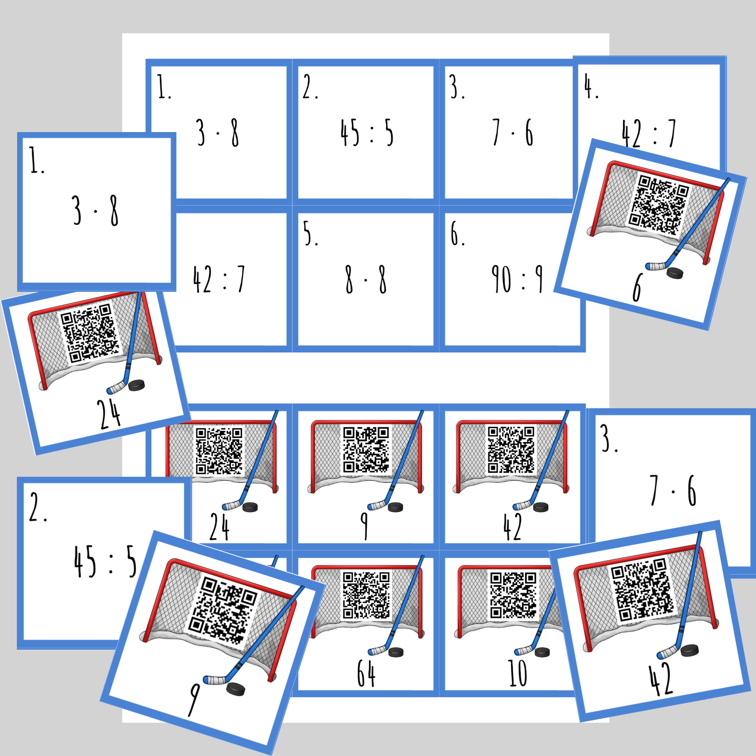 Žáci si samostatně nebo ve dvojicích vyhledají kartičku s matematickým příkladem, který vypočítají. Po správném výpočtu se pohybují po třídě a hledají kartičku s obrázkem hokejové branky a odpovídajícím výsledkem.