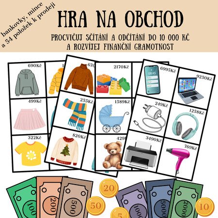 Materiál obsahuje bankovky, mince a kartičky k prodeji, které je třeba vystřihnout a zalaminovat.