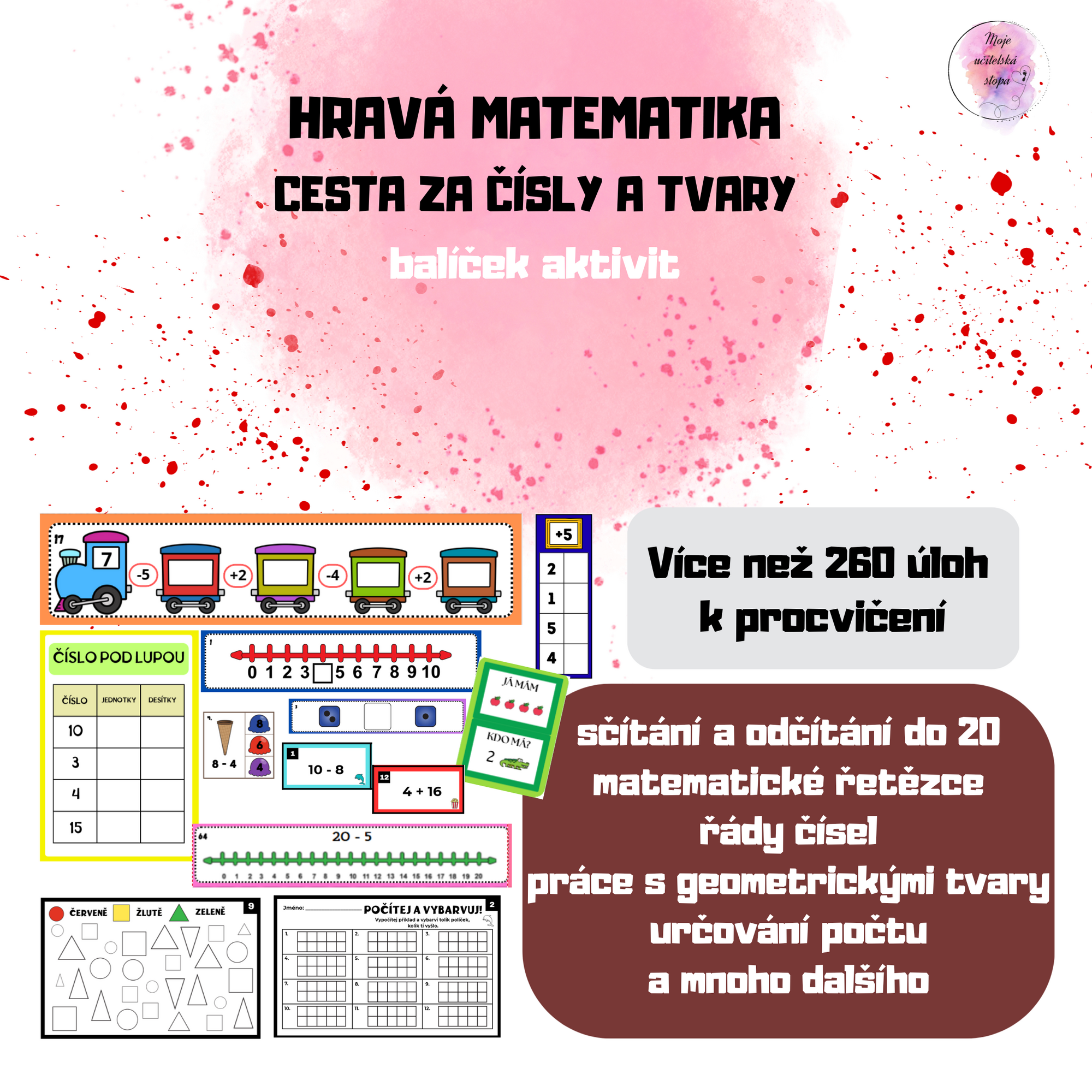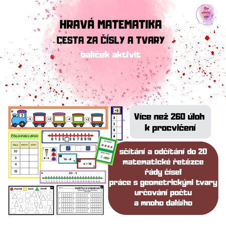 Matematický balíček vznikl jako praktický pomocník při výuce matematiky v 1. třídě nebo v úvodu 2. třídy. Najdete v něm pestrou škálu hravých aktivit, které podporují nejen početní dovednosti, ale také logické myšlení, práci s tvary a rozvoj jemné motoriky.