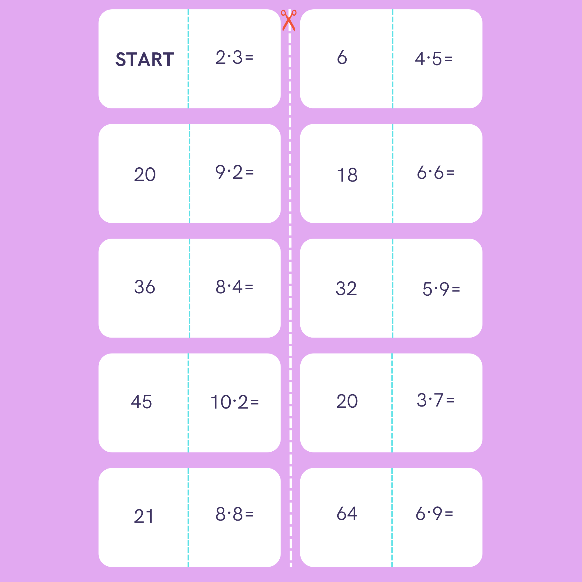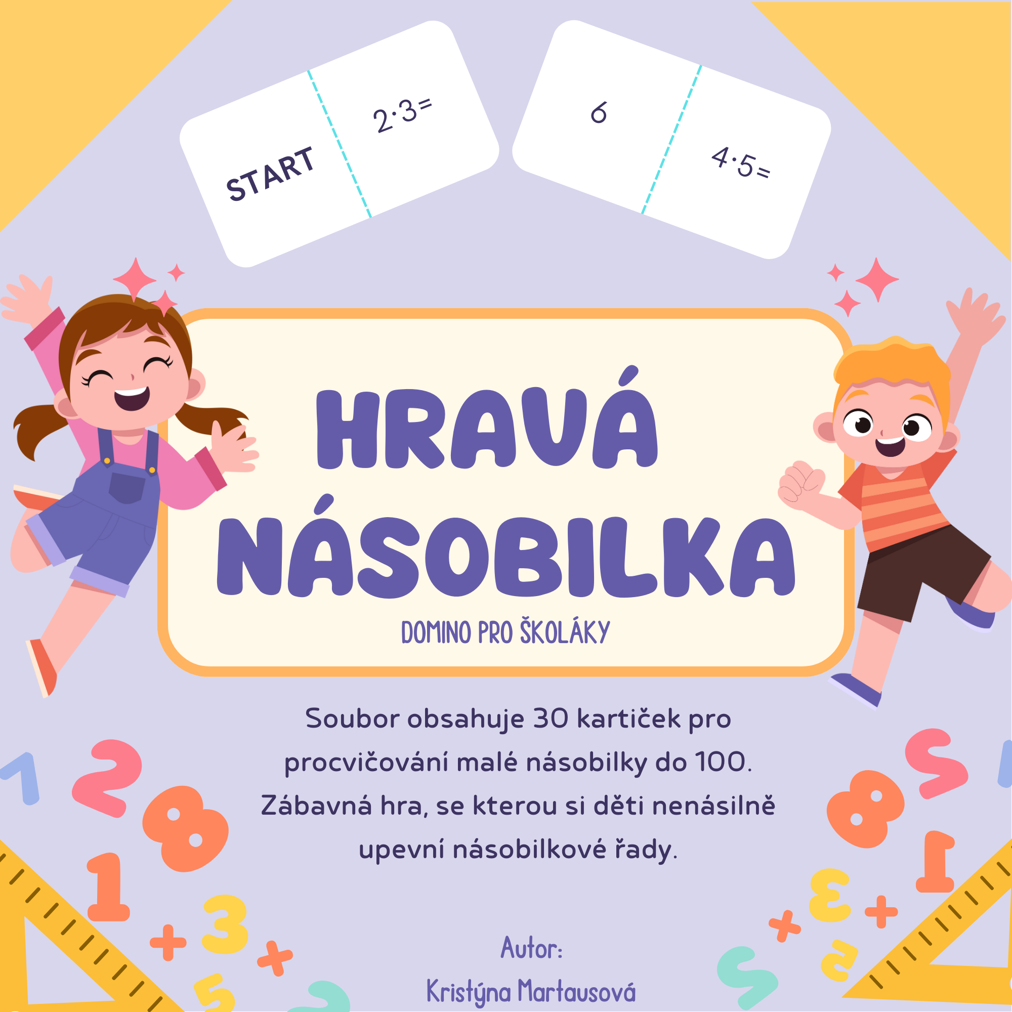 Tento materiál je určený pro zábavné procvičování malé násobilky do 100. Obsahuje 30 domino kartiček, které si děti mohou vystřihnout a skládat do dlouhého řetězu. Na jedné straně kartičky je výsledek, na druhé násobilkový příklad. Úkolem je správně propojit příklad s odpovídajícím výsledkem.