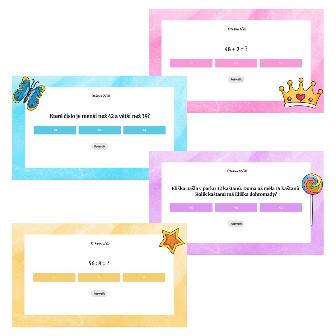 - Typy úloh se střídají, přičemž témata zahrnuta v kvízu jsou: sčítání a odčítání do 100, násobení a dělení, slovní úlohy, porovnávání, doplňování řady, dosazování čísla do příkladu