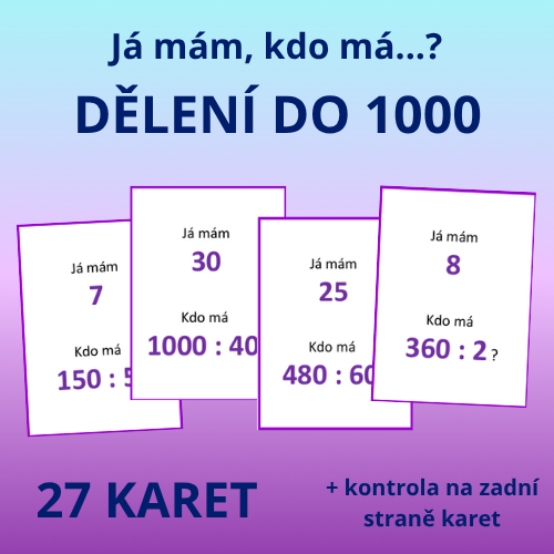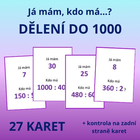 Popis aktivity: Aktivita obsahuje 27 karet s příklady. Karty obsahují 26 různých dvojic příkladů na procvičení dělení do 1000.