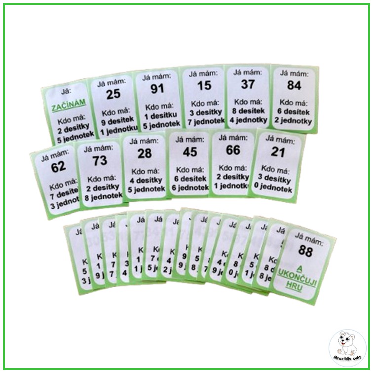 Každý hráč dostane jednu nebo více kartiček, na nichž je vždy napsáno Já mám (odpověď) a Kdo má (otázka pro dalšího hráče). Kartičky tvoří uzavřenou řadu. Hra začíná u hráče, který má startovací kartičku Já začínám. Hráč nahlas přečte svůj lístek: Já začínám. Kdo má 2 desítky, 5 jednotek? Následuje ten, kdo má kartičku s číslem 25 a přečte svůj text. Takto se postupně vystřídají všichni. Hra končí ve chvíli, kdy poslední hráč přečte Já mám 88 a ukončuji hru. Děti musí dávat pozor, poslouchat ostatní a reagovat ve správnou chvíli. Pokud se někdo splete, spoluhráči mu mohou poradit.