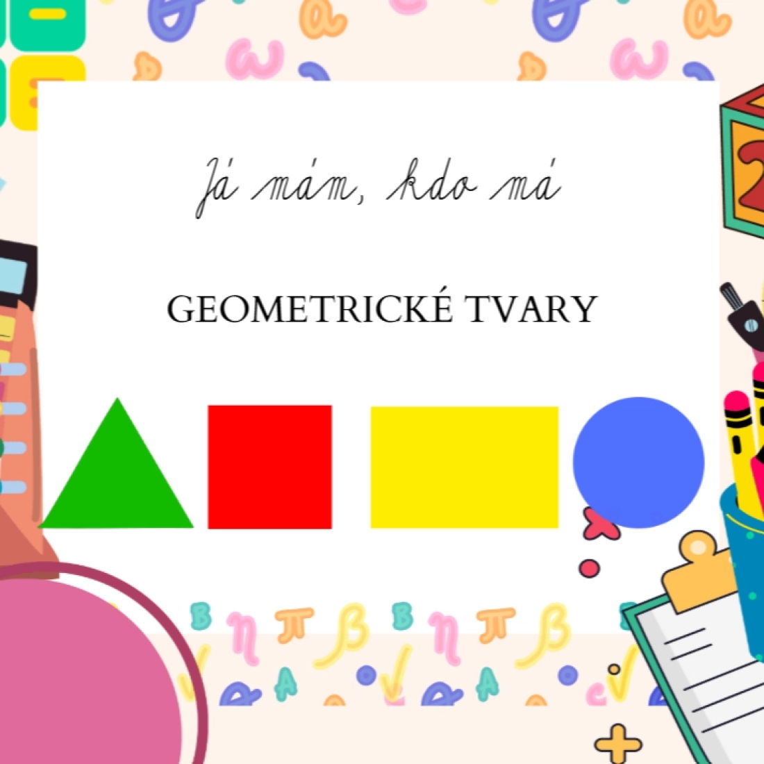 Materiál je zaměřený na nauku a prohloubení geometrických tvarů (obdélník, čtverec, trojúhelník, kruh) a barev (základní i rozšířené) formou hry.