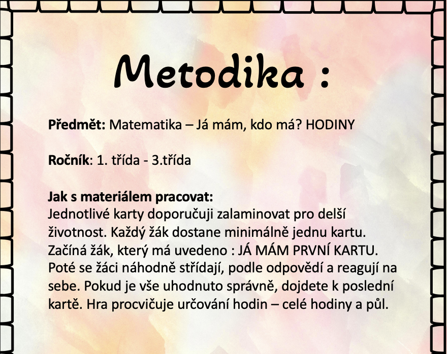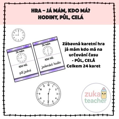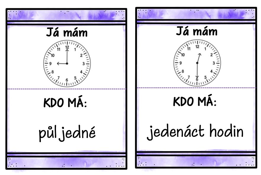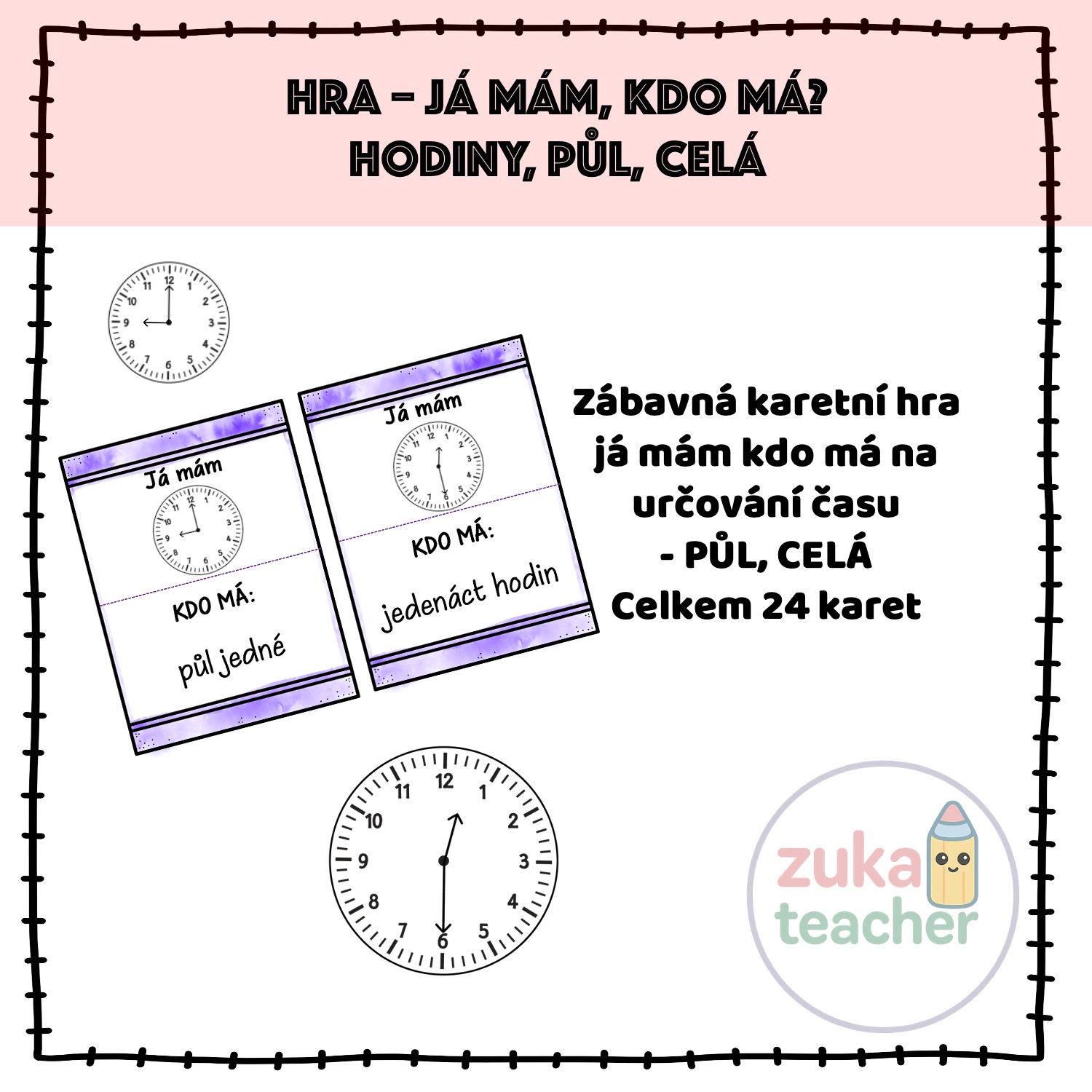 Jednotlivé karty doporučuji zalaminovat pro delší životnost. Každý žák dostane minimálně jednu kartu. Začíná žák, který má uvedeno : JÁ MÁM PRVNÍ KARTU. Poté se žáci náhodně střídají, podle odpovědí a reagují na sebe. Pokud je vše uhodnuto správně, dojdete k poslední kartě. Hra procvičuje určování hodin – celé hodiny a půl.