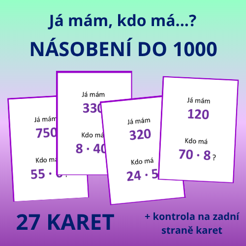 Popis aktivity: Aktivita obsahuje 27 karet s příklady. Karty obsahují 26 různých dvojic příkladů na procvičení násobení do 1000. Pro zjednodušení pamětného počítání je na místě jednotek vždy číslice 0.