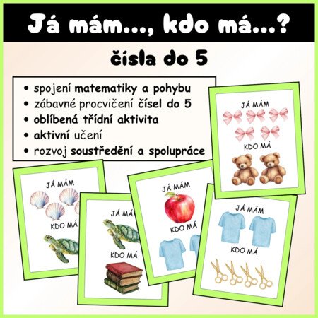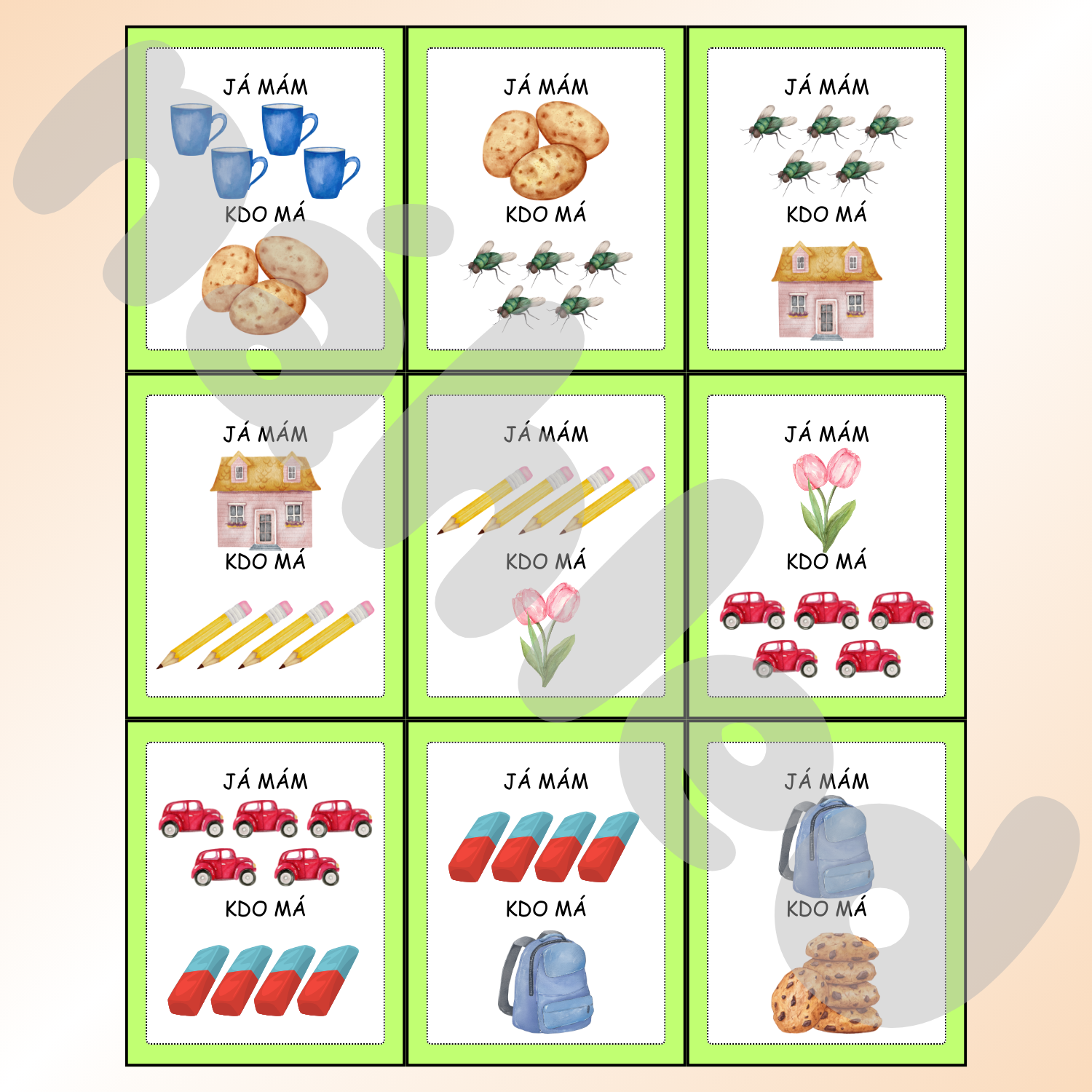- Každé dítě dostane kartičku s dvojicí vět: „Já mám…“ a „Kdo má…“.