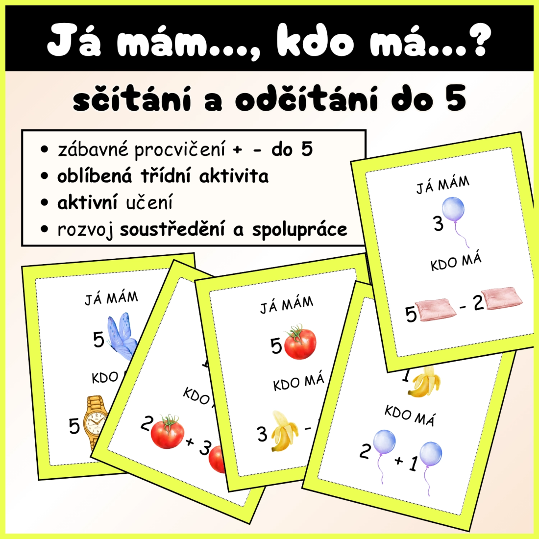 Každá karta má část „Já mám…“ a „Kdo má…“, doplněnou o obrázky (jablka, motýli, houby aj.), které dětem usnadňují porozumění zadání.