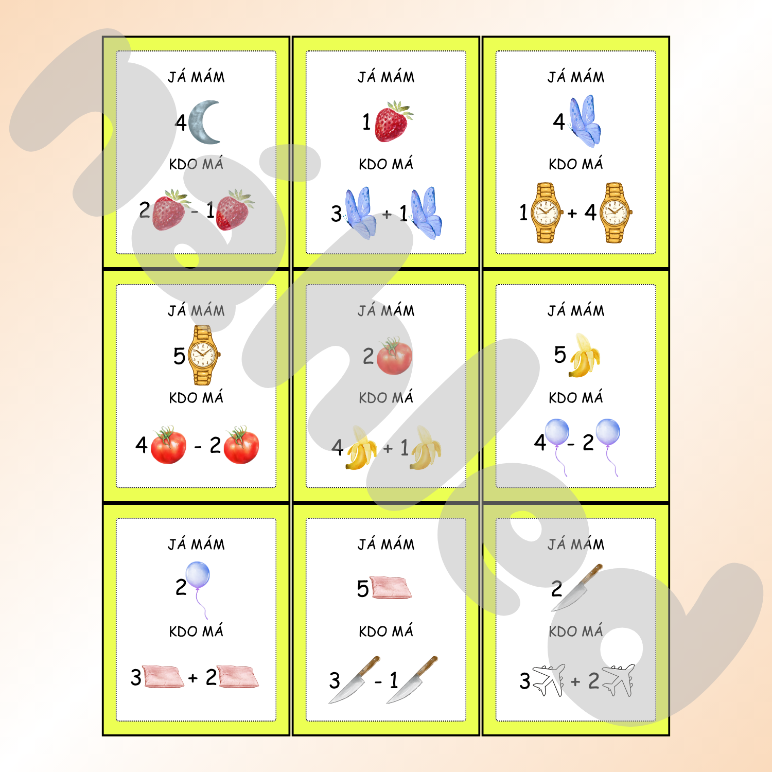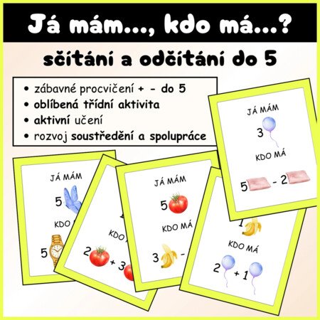 Materiál obsahuje sadu karet s příklady na sčítání a odčítání do 5.
