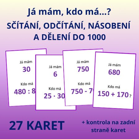Popis aktivity: Aktivita obsahuje 27 karet s příklady. Karty obsahují 26 různých dvojic příkladů na procvičení sčítání, odčítání, násobení a dělení do 1000.