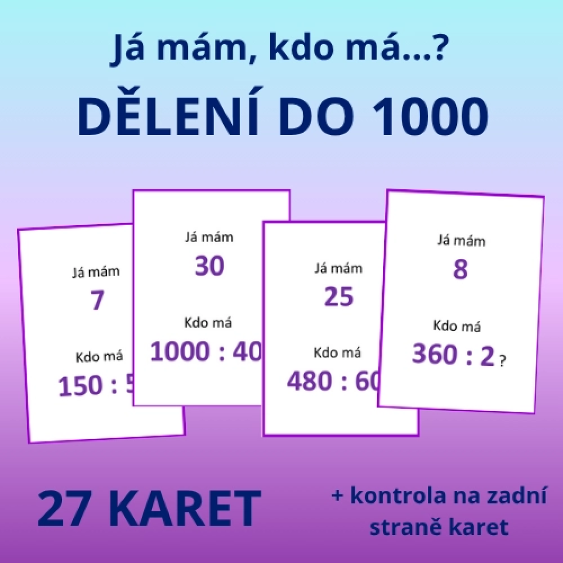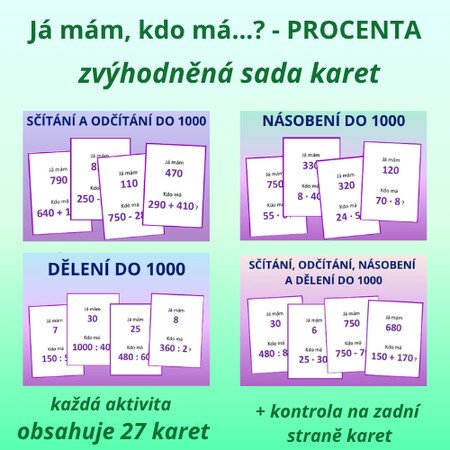 Každá aktivita obsahuje 27 karet. Karty obsahují 26 různých dvojic příkladů na procvičení sčítání, odčítání, násobení a dělení do 1000.
