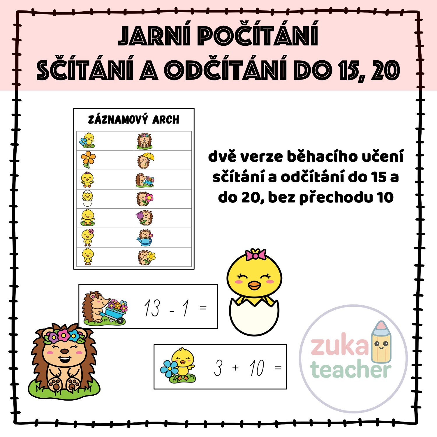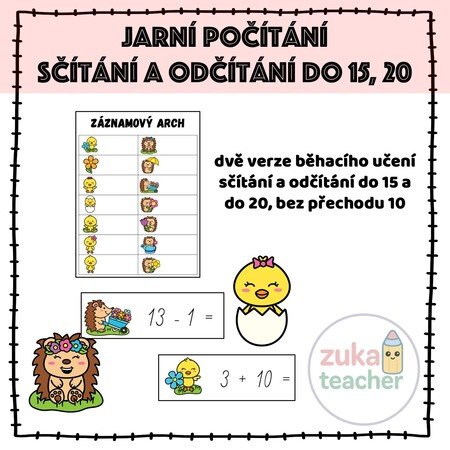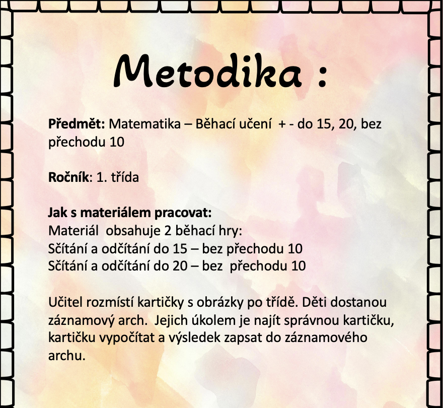 Učitel rozmístí kartičky s obrázky po třídě. Děti dostanou záznamový arch. Jejich úkolem je najít správnou kartičku, kartičku vypočítat a výsledek zapsat do záznamového archu.