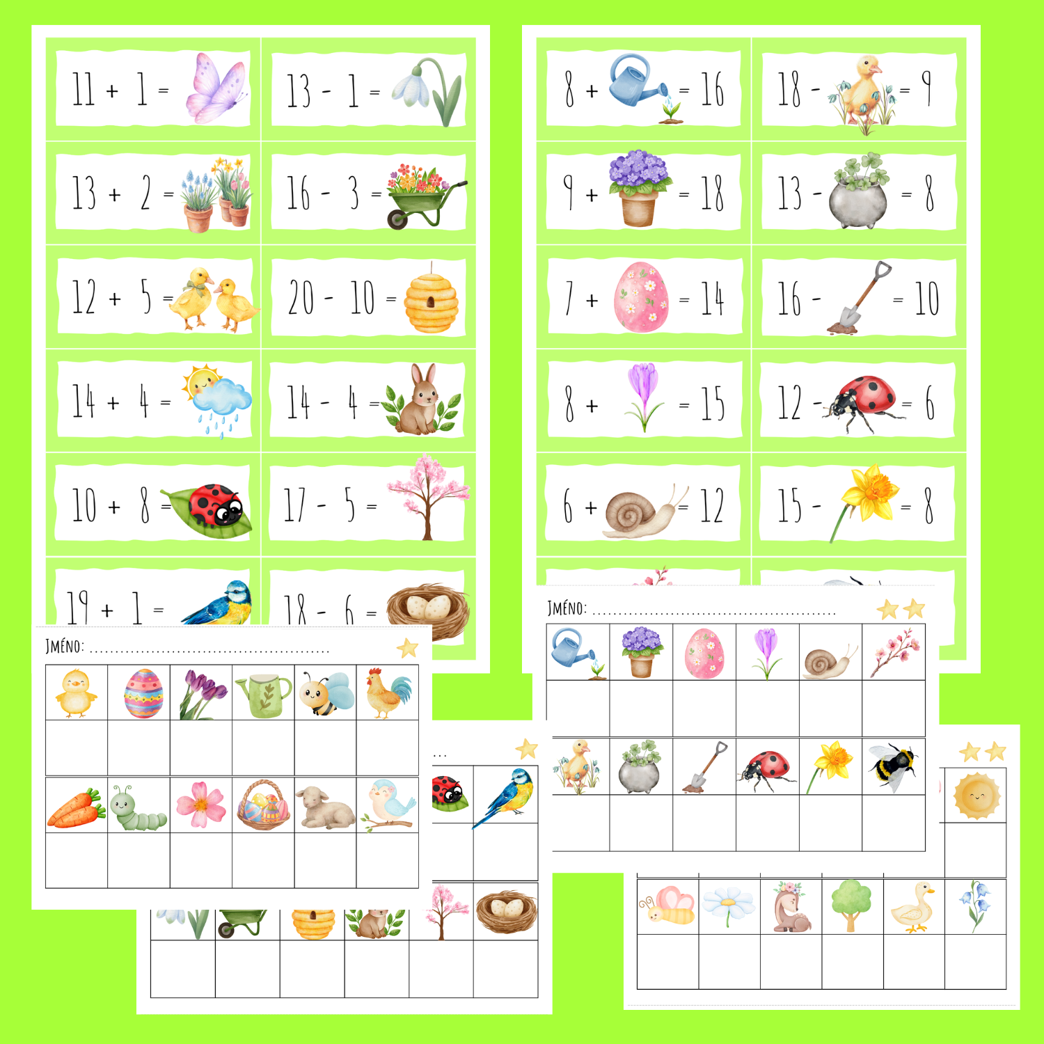 „Jarní běhací počítání pro prvňáčky“ je praktický a vizuálně poutavý materiál, který kombinuje procvičování aritmetiky s pohybem, hrou a samostatnou kontrolou výsledků. jarní tematický design přináší do výuky příjemnou atmosféru a podporuje radost z učení.