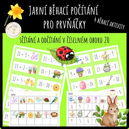 Jarní běhací počítání pro prvňáčky je hravý a pohybový výukový materiál určený pro 1. ročník ZŠ. Žáci si procvičí sčítání a odčítání do 20 zábavnou formou. Materiál je laděn do jarních barev a motivů (květiny, hmyz, Velikonoce aj.), což zvyšuje jeho atraktivitu.