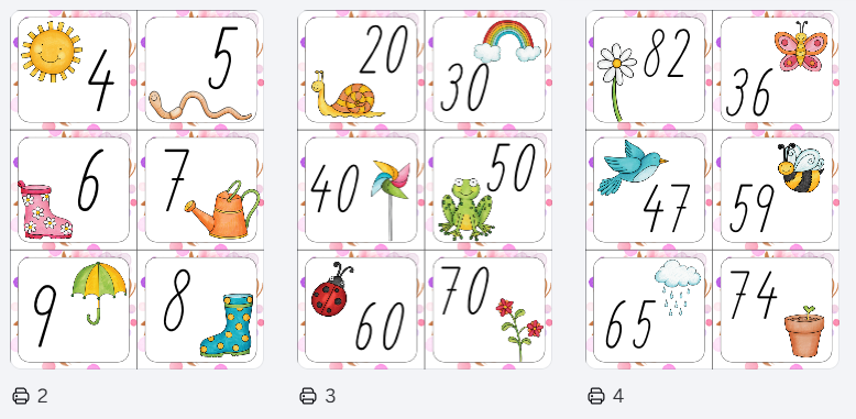 - kartičky s obrázky a čísly (6 jednociferných, 6 desítek, 6 dvojciferných)