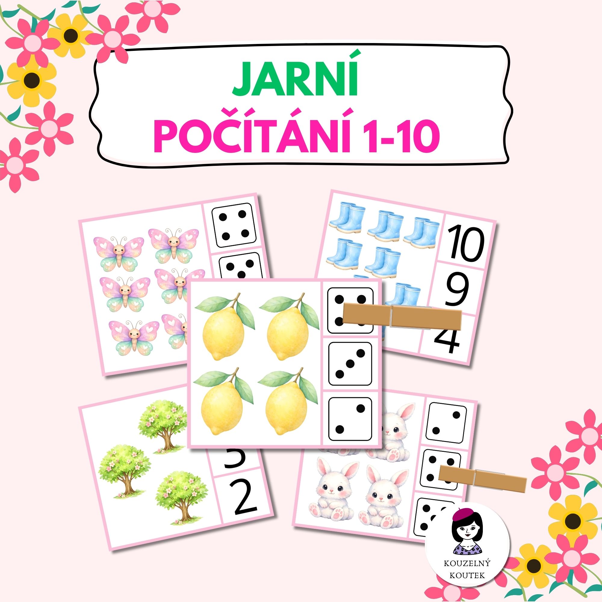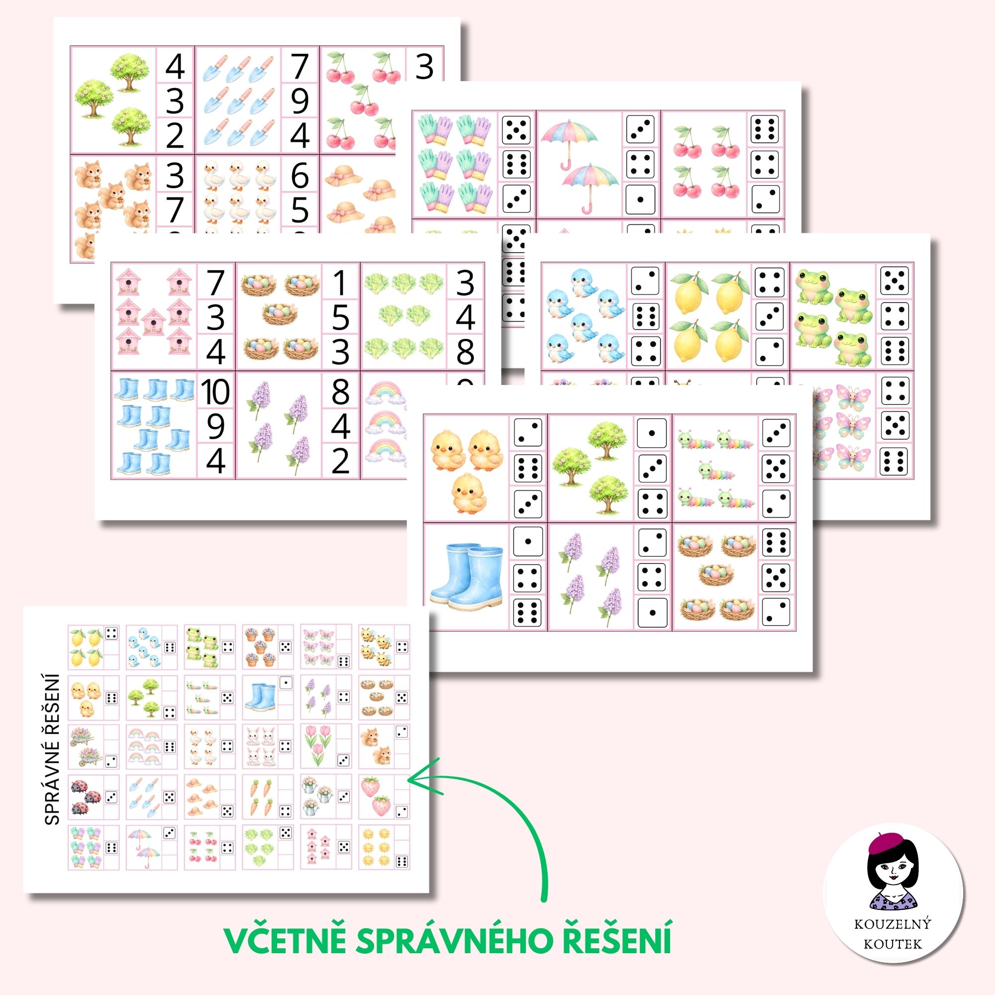 Každá z 60 kartiček obsahuje obrázky. Úkolem dítěte je je správně spočítat a označit správnou odpověď kolíčkem (buď podle číslice či počtu puntíků).