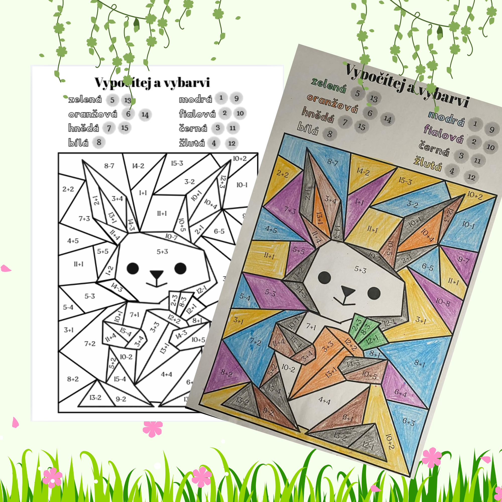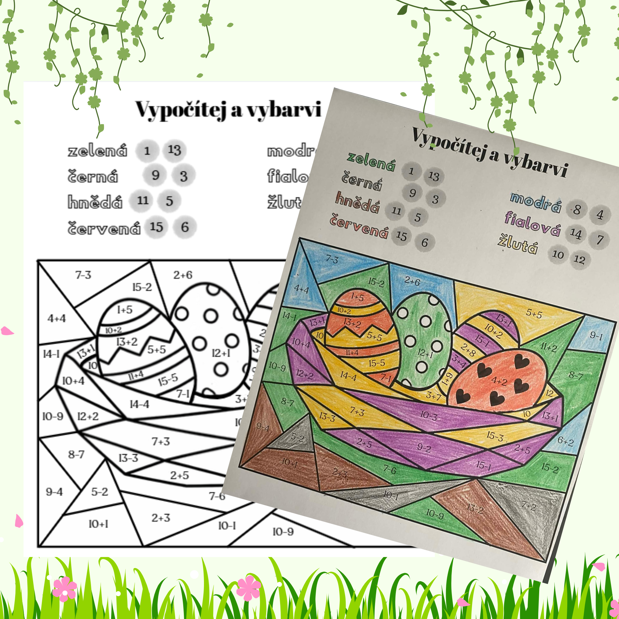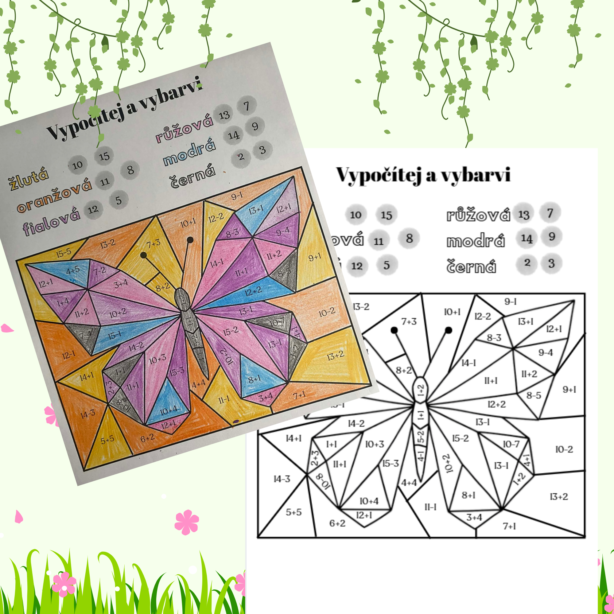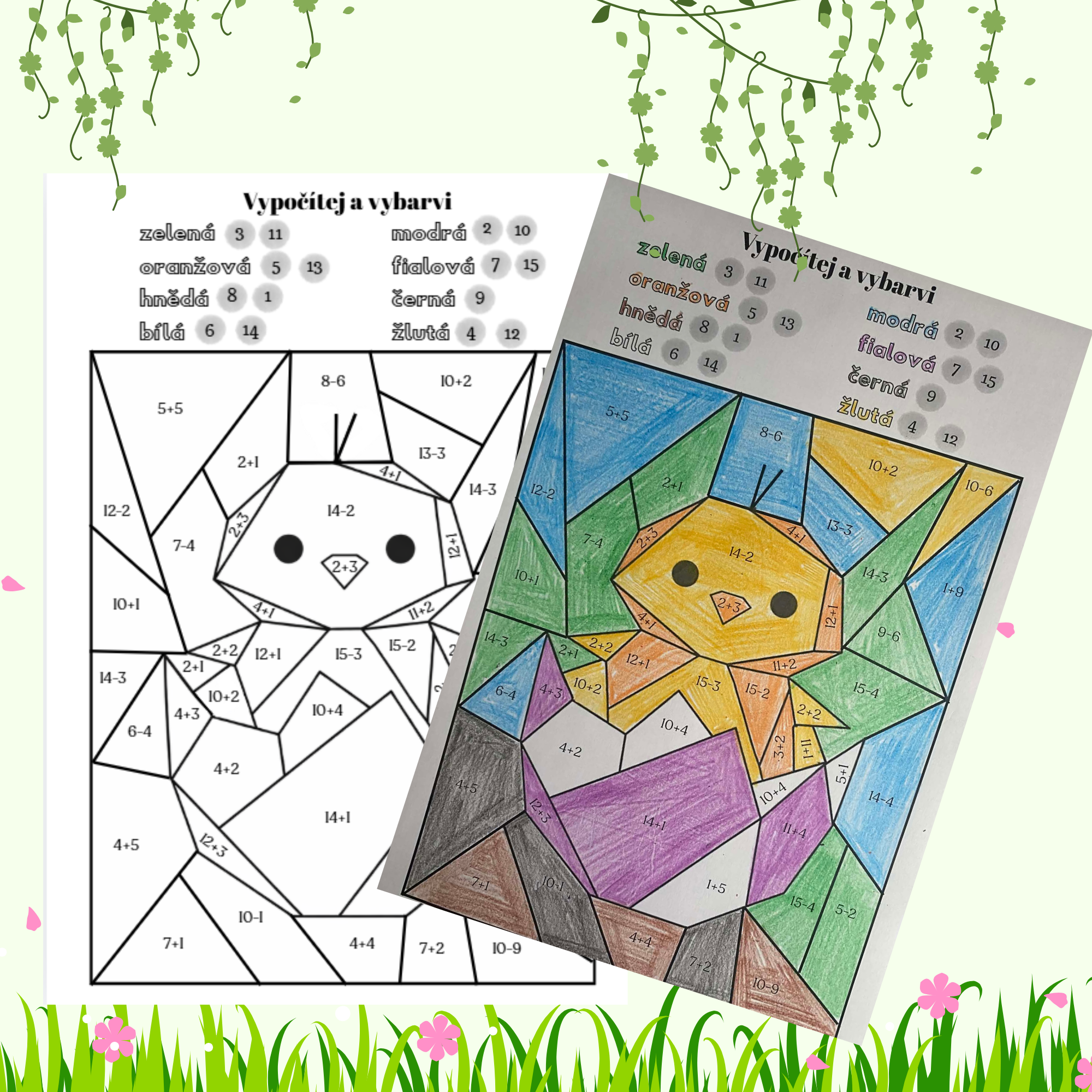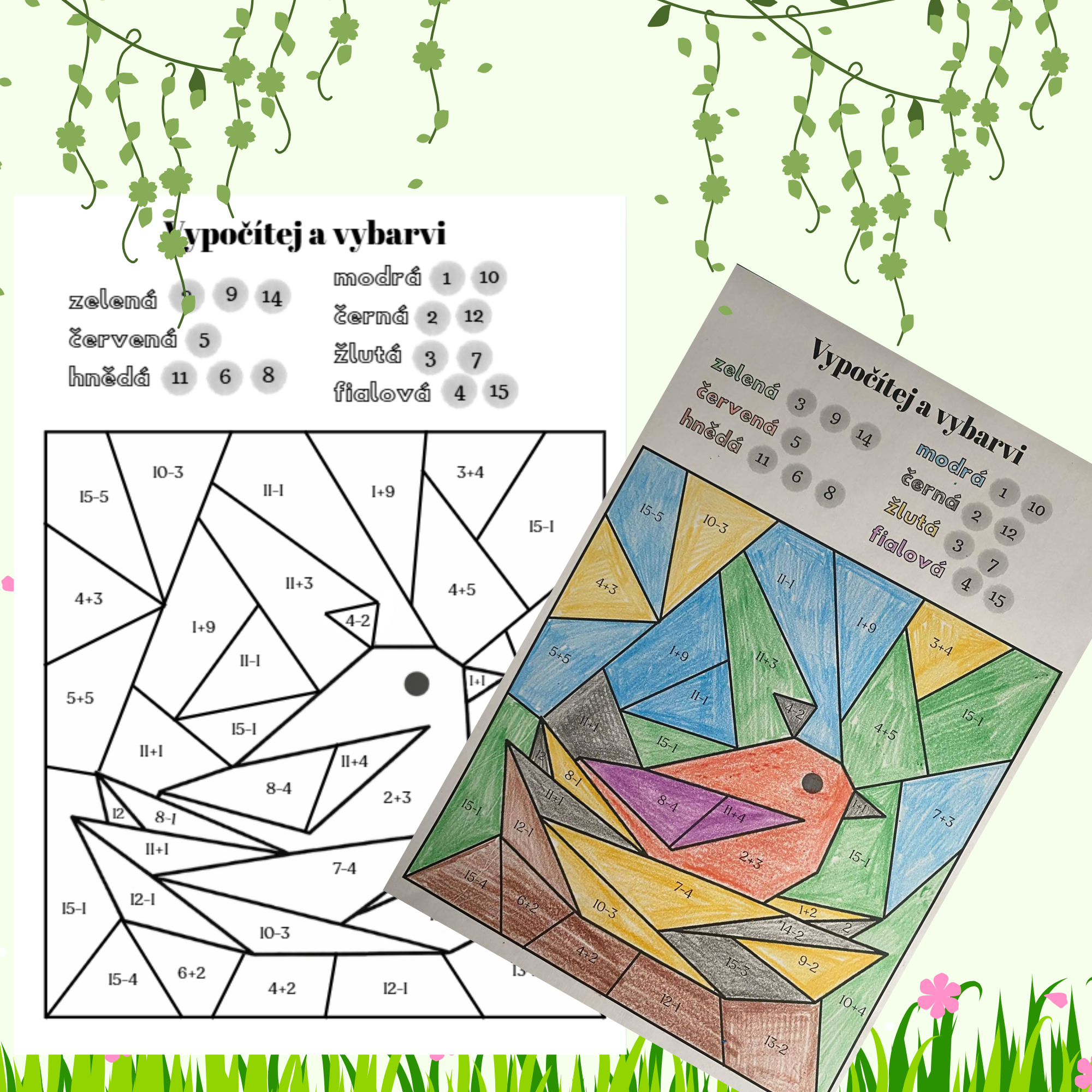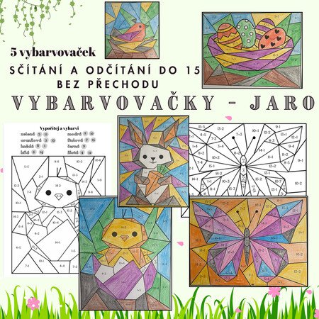 Obsahuje 5 vybarvovaček s jarní tématikou. Procvičuje sčítání a odčítání do 15 bez přechodu přes 10. Je vhodný pro výuku matematiky v 1. ročníku ZŠ. Obrázky po vybarvení podle klíče ztvárňují: