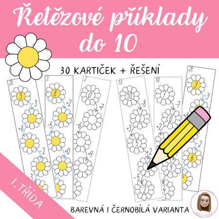 Jarní řetězové příklady pro procvičení sčítání a odčítání do 10. Soubor obsahuje 30 kartiček s příklady + 30 kontrolních kartiček.