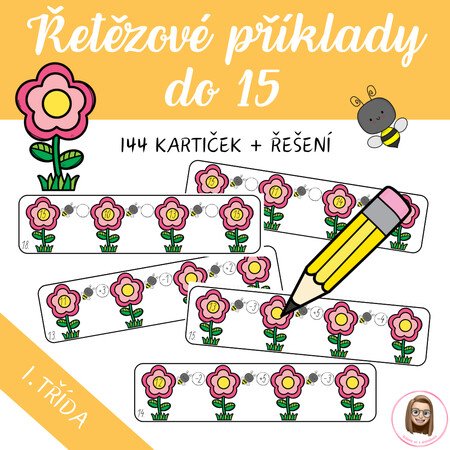 Materiál obsahuje 144 kartiček s příklady a 144 kontrolních kartiček ve třech úrovních obtížnosti (do 10, do 15 bez přechodu i s přechodem přes 10).