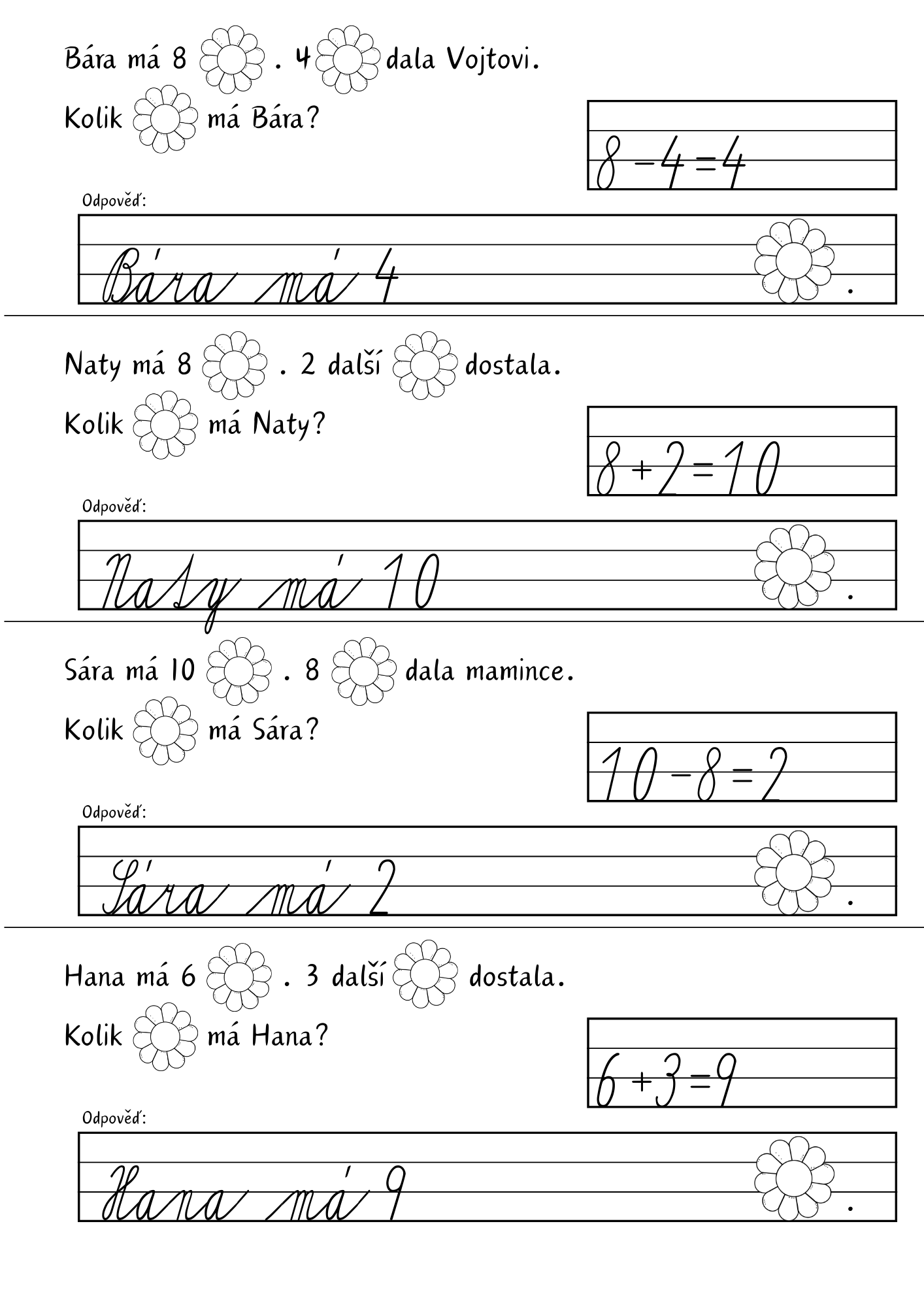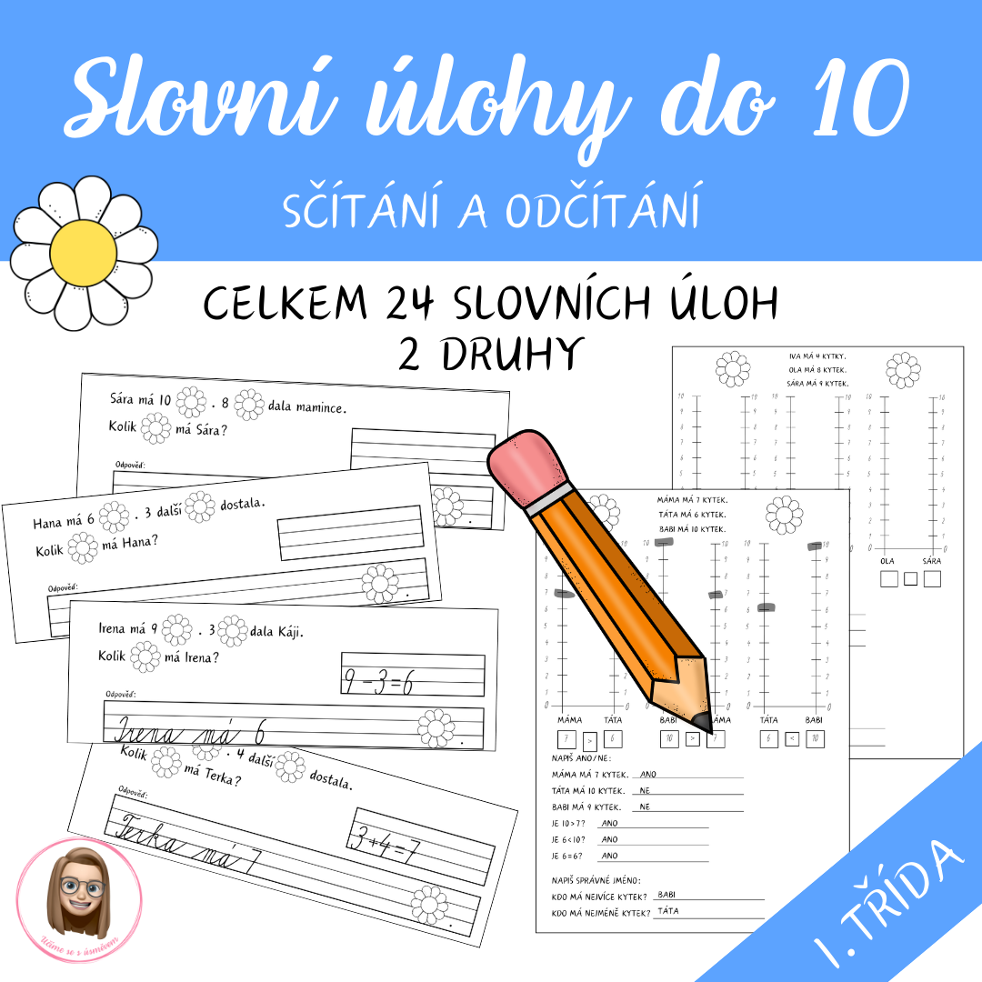 Soubor obsahuje 12 pracovních listů s 24 slovními úlohami v oboru do 10 a jejich řešení. Děti procvičují sčítání, odčítání, porovnávání čísel a práci s číselnou osou.