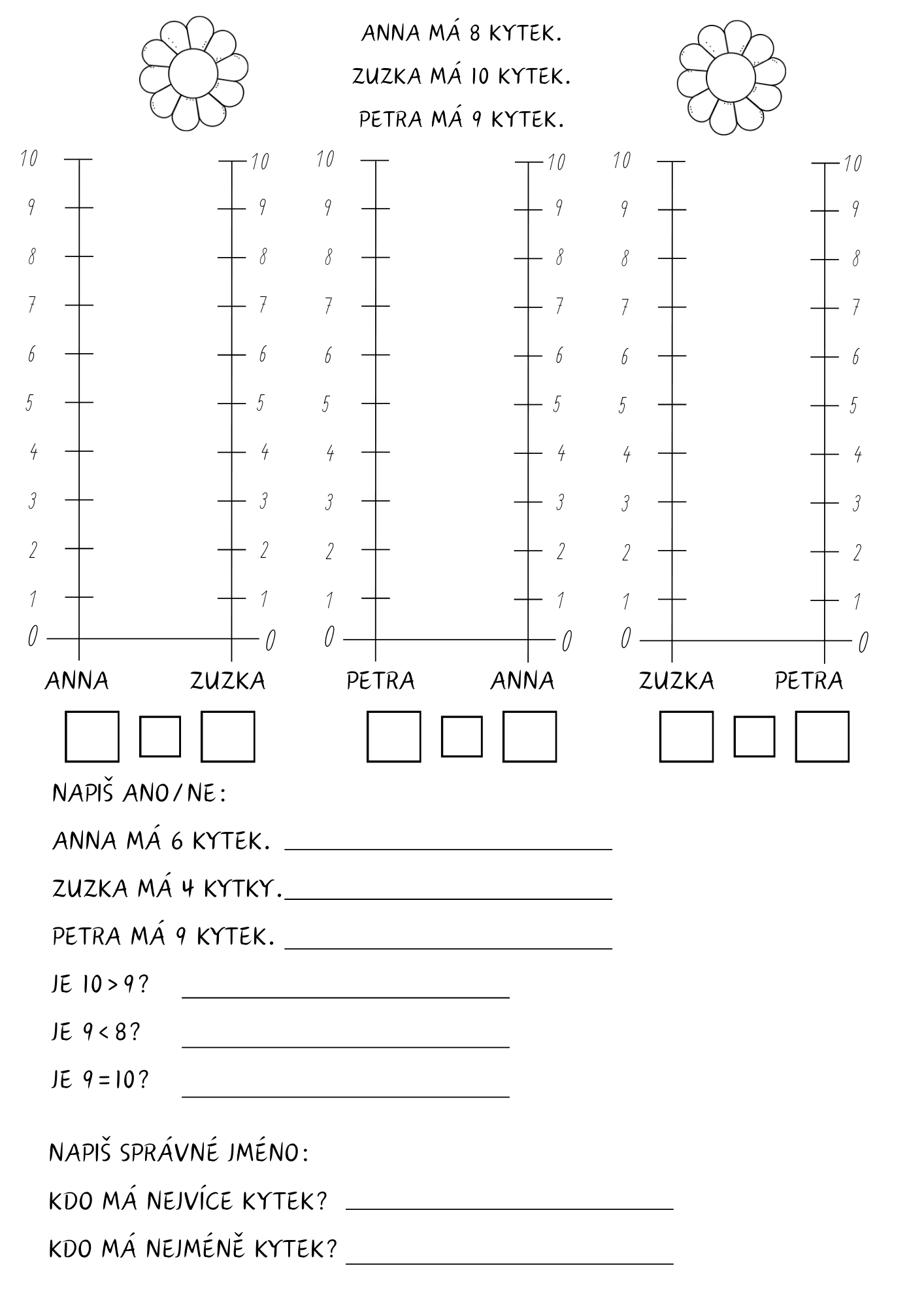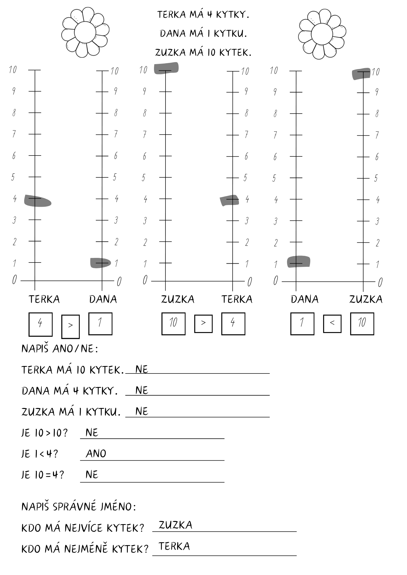 Soubor obsahuje dva typy slovních úloh. V prvním typu žáci zapisují příklad a odpověď na základě krátkého textu. Druhý typ úloh rozvíjí práci s číselnou osou a porovnávání čísel pomocí znaků > < =. Žáci zároveň rozhodují o pravdivosti výroků a určují, kdo má nejvíce nebo nejméně.